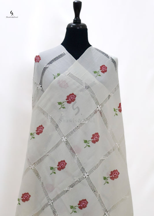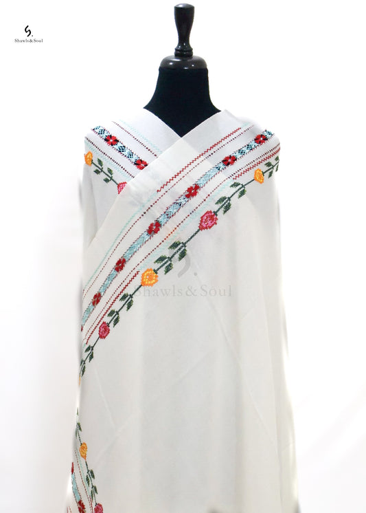 Explore timeless artistry with cross stitch embroidered wool shawls.