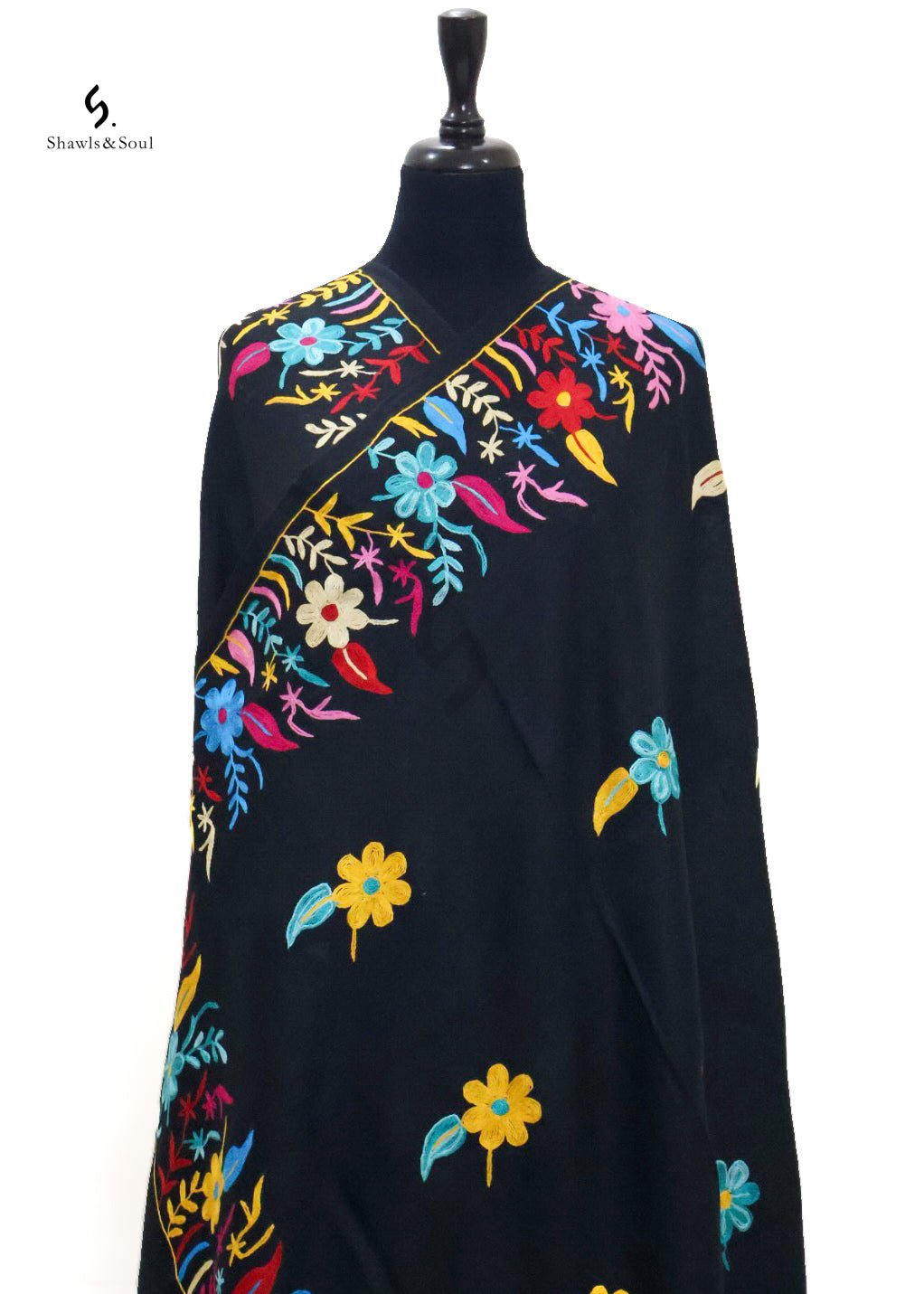 Elevate your style with the Aakash Black B shawl, featuring luxurious black wool adorned with intricate multicolor embroidery through expert Aari work.