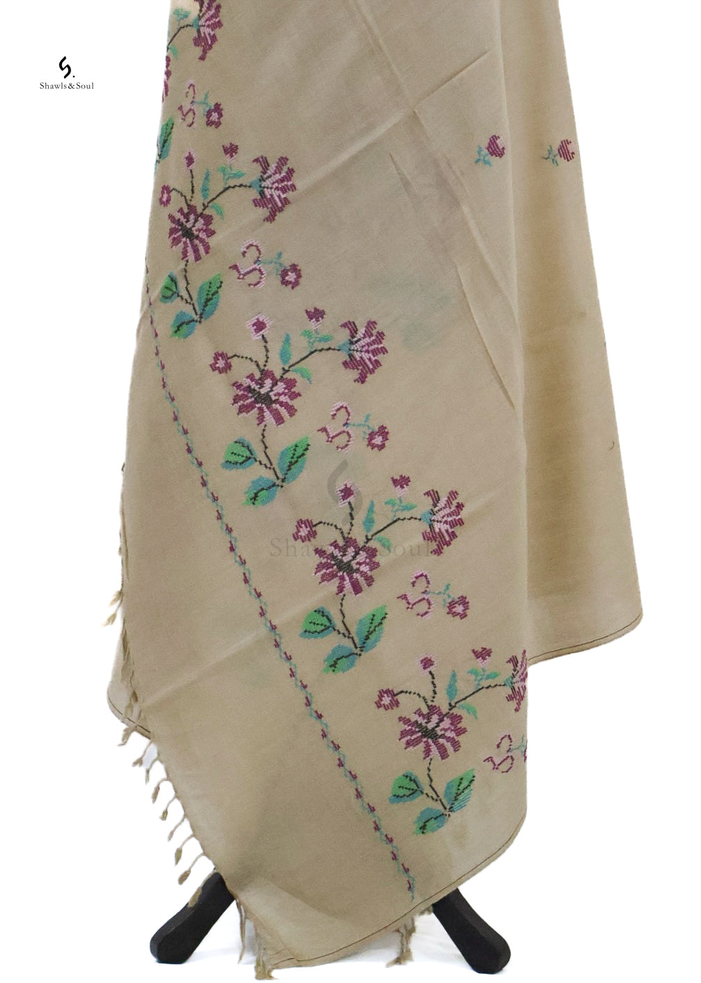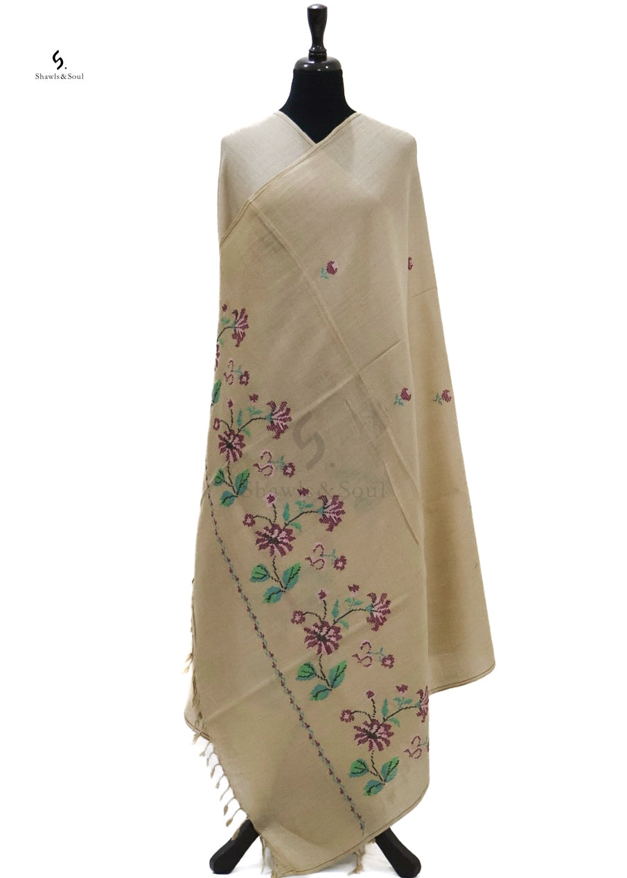 Amber Shawl showcases exquisite cross stitch embroidery delicately crafted with premium wool. This elegant piece blends artistry and quality, offering a beautiful design that enhances your collection without exceeding your budget. Ideal for those who appreciate refined craftsmanship and timeless appeal.