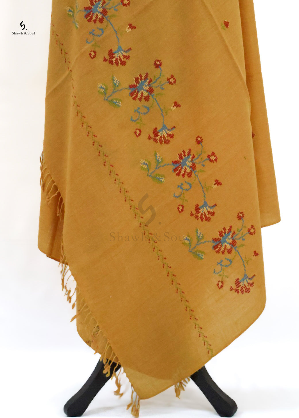 Amber Shawl showcases exquisite cross stitch embroidery delicately crafted with premium wool. This elegant piece blends artistry and quality, offering a beautiful design that enhances your collection without exceeding your budget. Ideal for those who appreciate refined craftsmanship and timeless appeal.