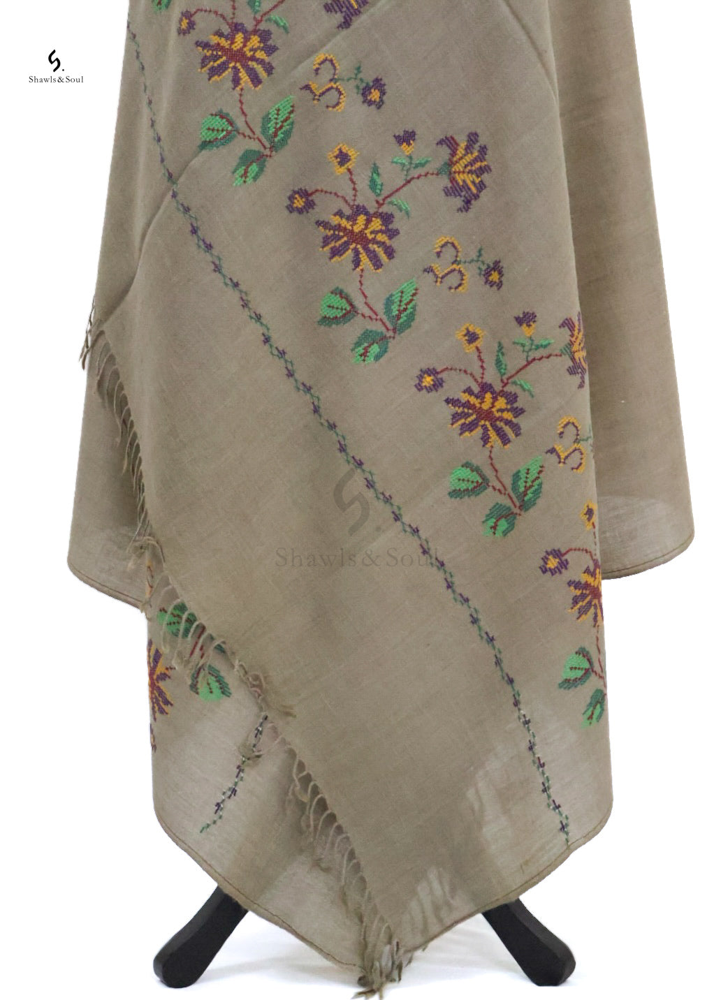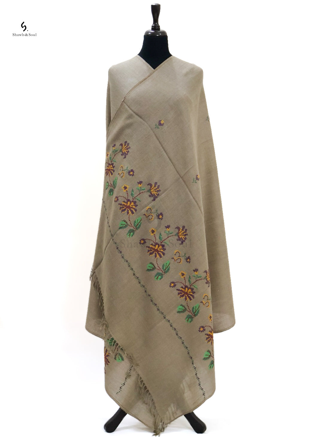 Amber Shawl showcases exquisite cross stitch embroidery delicately crafted with premium wool. This elegant piece blends artistry and quality, offering a beautiful design that enhances your collection without exceeding your budget. Ideal for those who appreciate refined craftsmanship and timeless appeal.