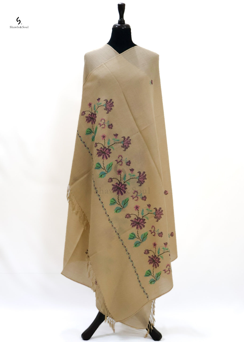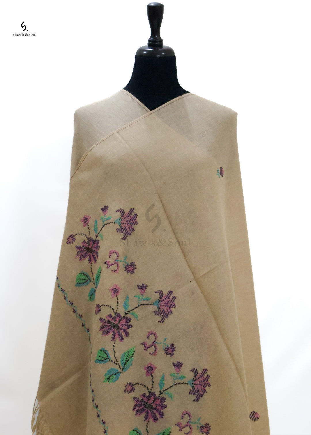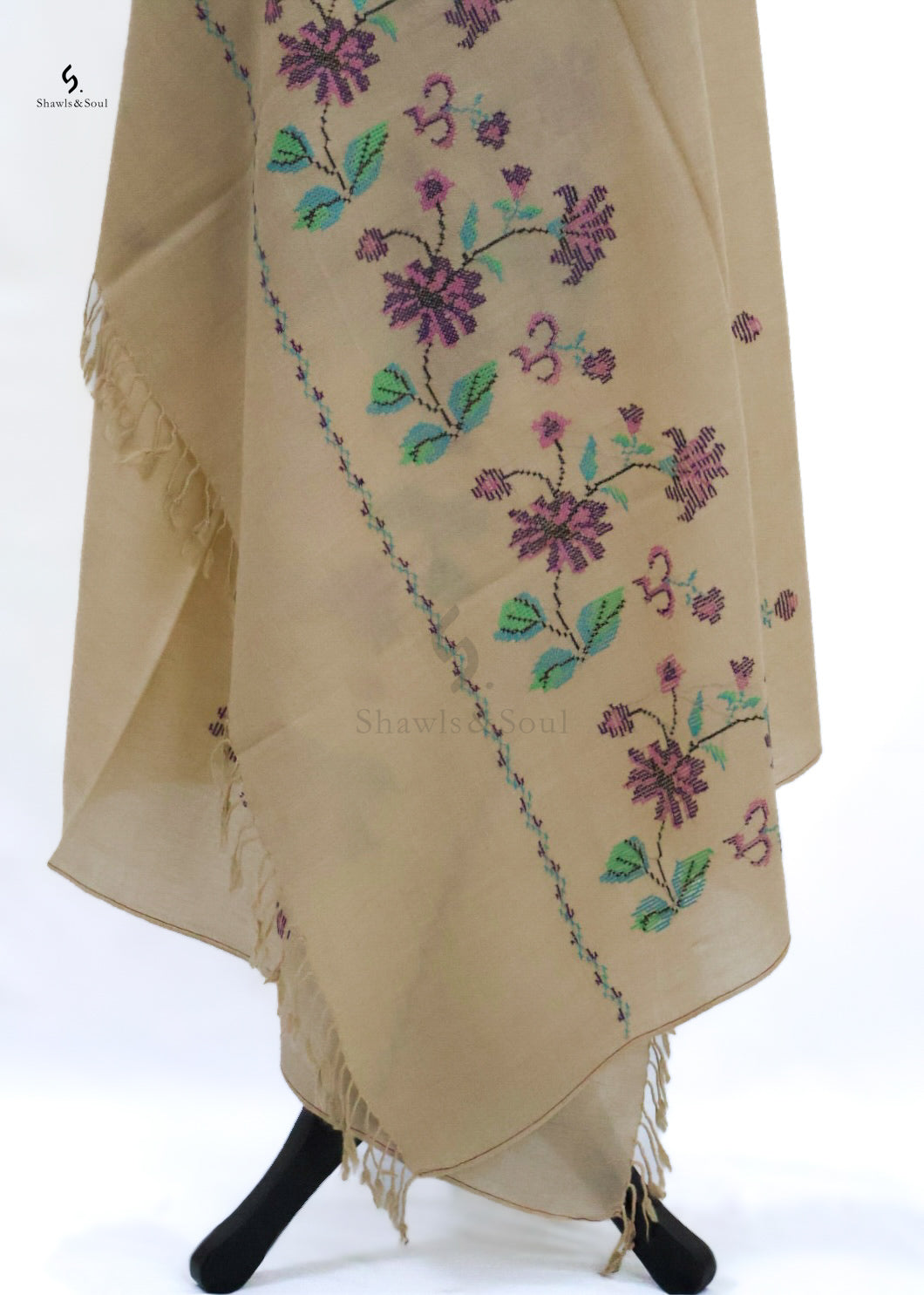 Amber Shawl showcases exquisite cross stitch embroidery delicately crafted with premium wool. This elegant piece blends artistry and quality, offering a beautiful design that enhances your collection without exceeding your budget. Ideal for those who appreciate refined craftsmanship and timeless appeal.