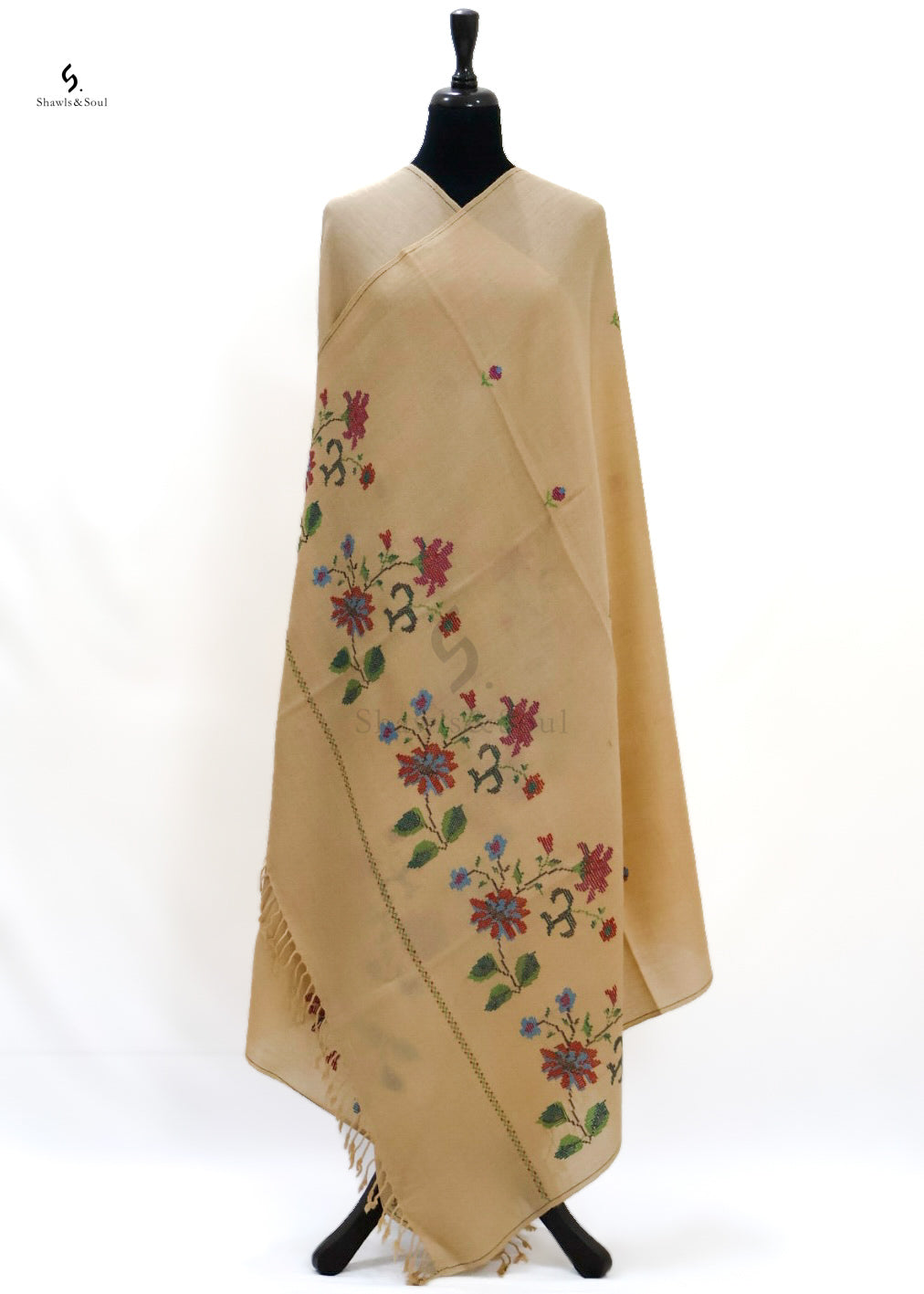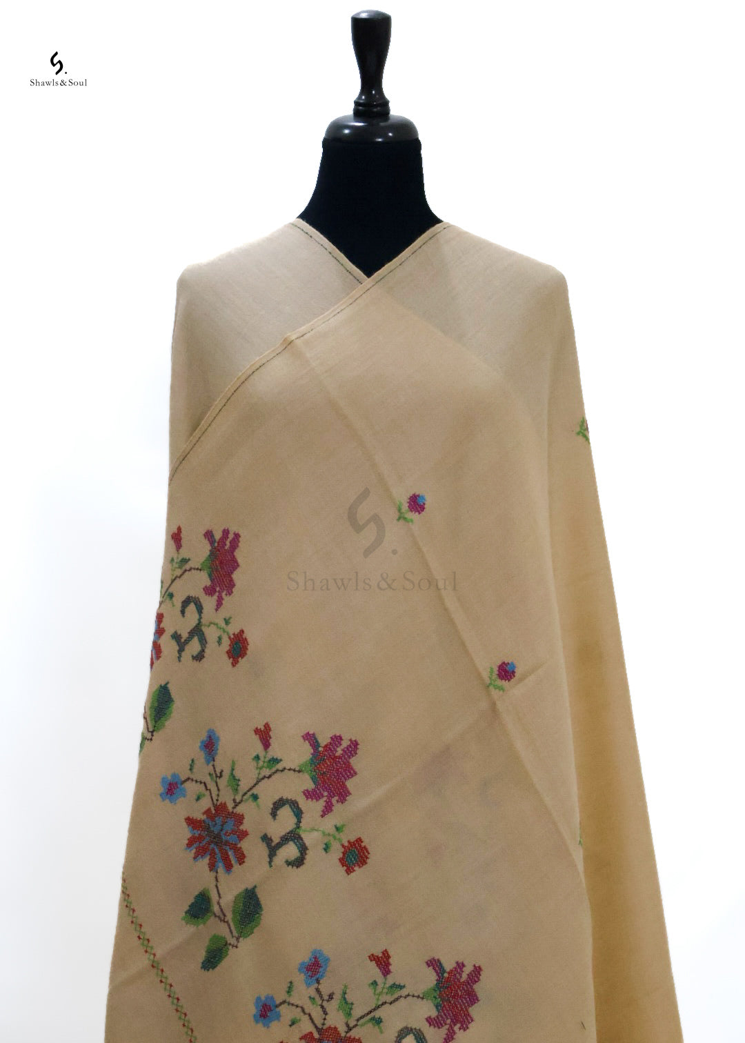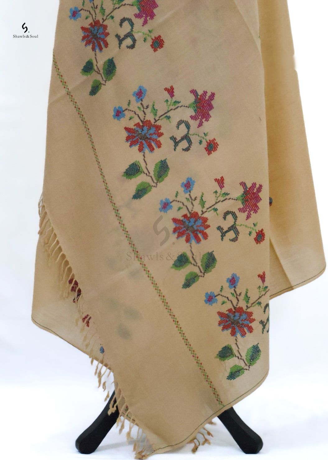Amber Shawl showcases exquisite cross stitch embroidery delicately crafted with premium wool. This elegant piece blends artistry and quality, offering a beautiful design that enhances your collection without exceeding your budget. Ideal for those who appreciate refined craftsmanship and timeless appeal.