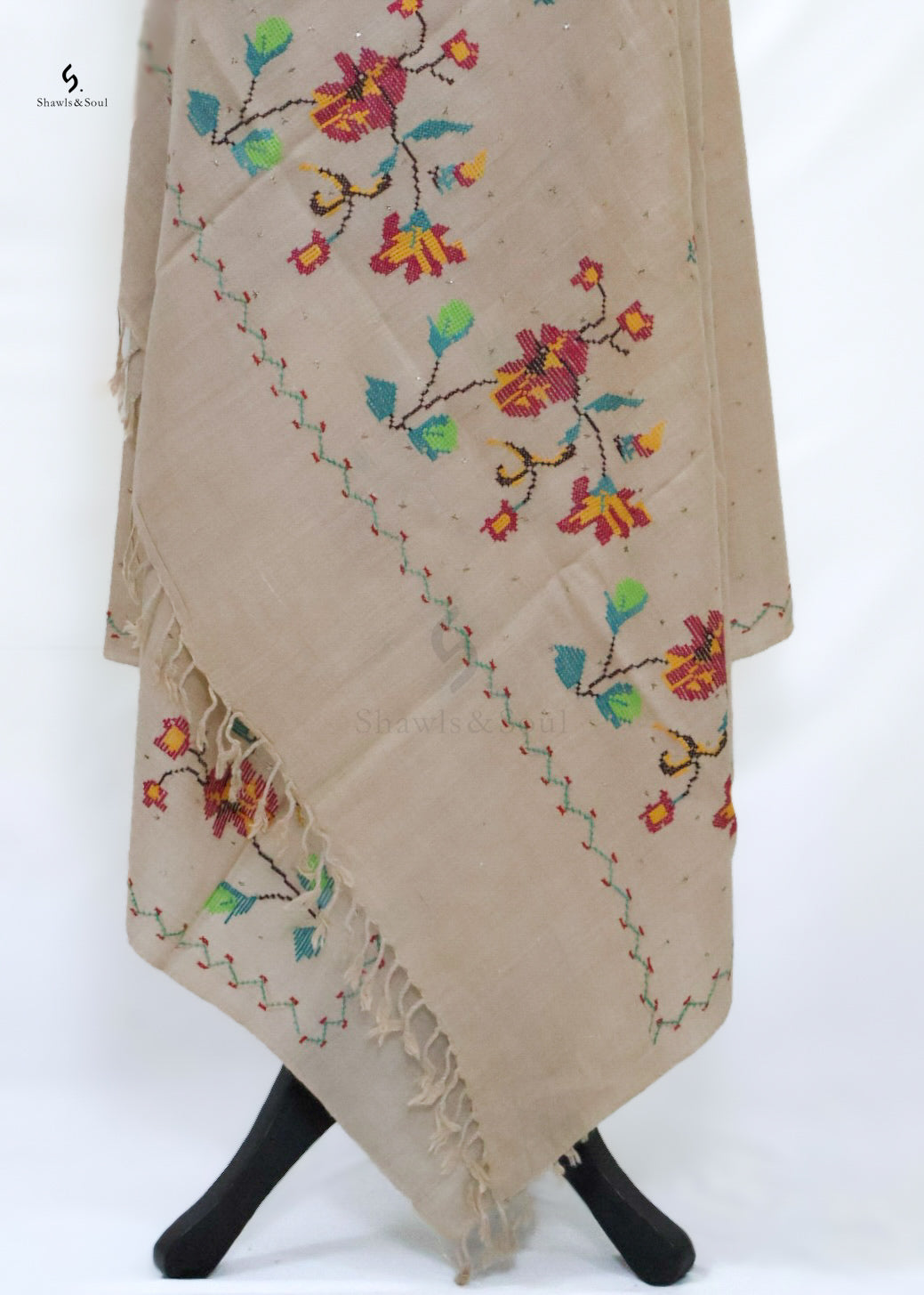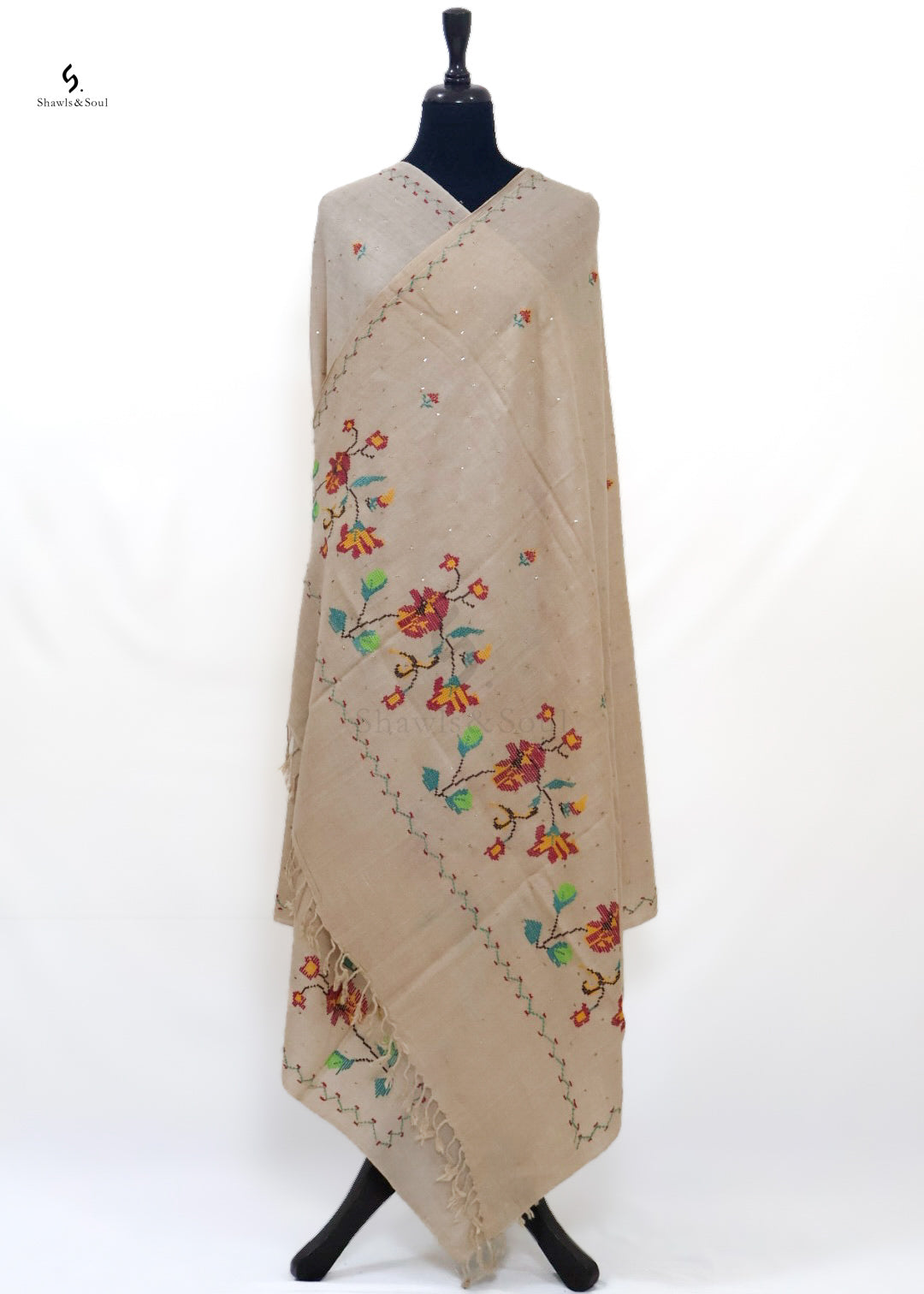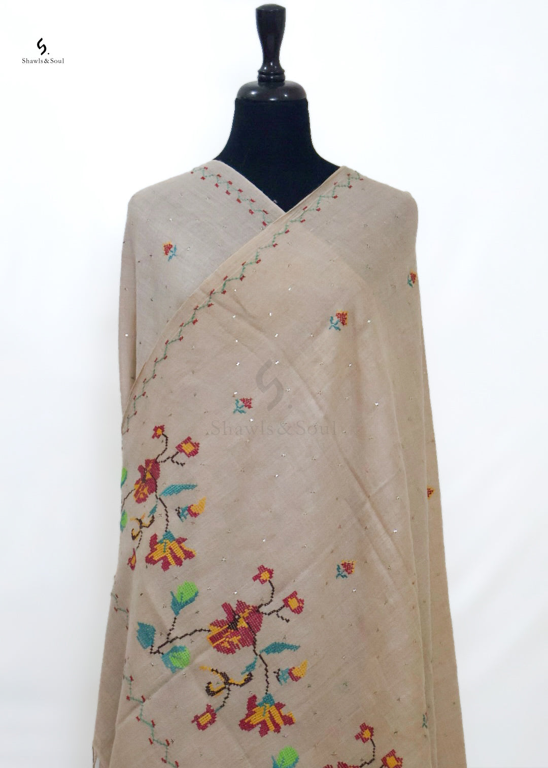 Elevate your ensemble with the Amber Mukesh, a woolen shawl exquisitely adorned with delicate cross stitch and shimmering mukesh embroidery. This sophisticated piece blends traditional craftsmanship with timeless elegance, offering both warmth and refined style for any occasion.