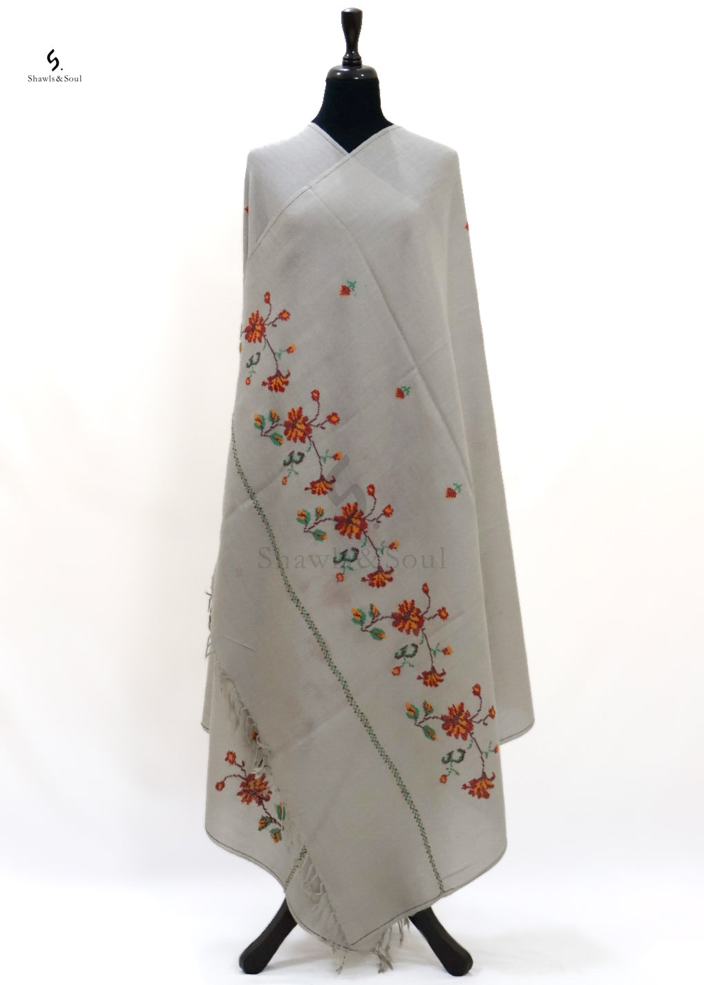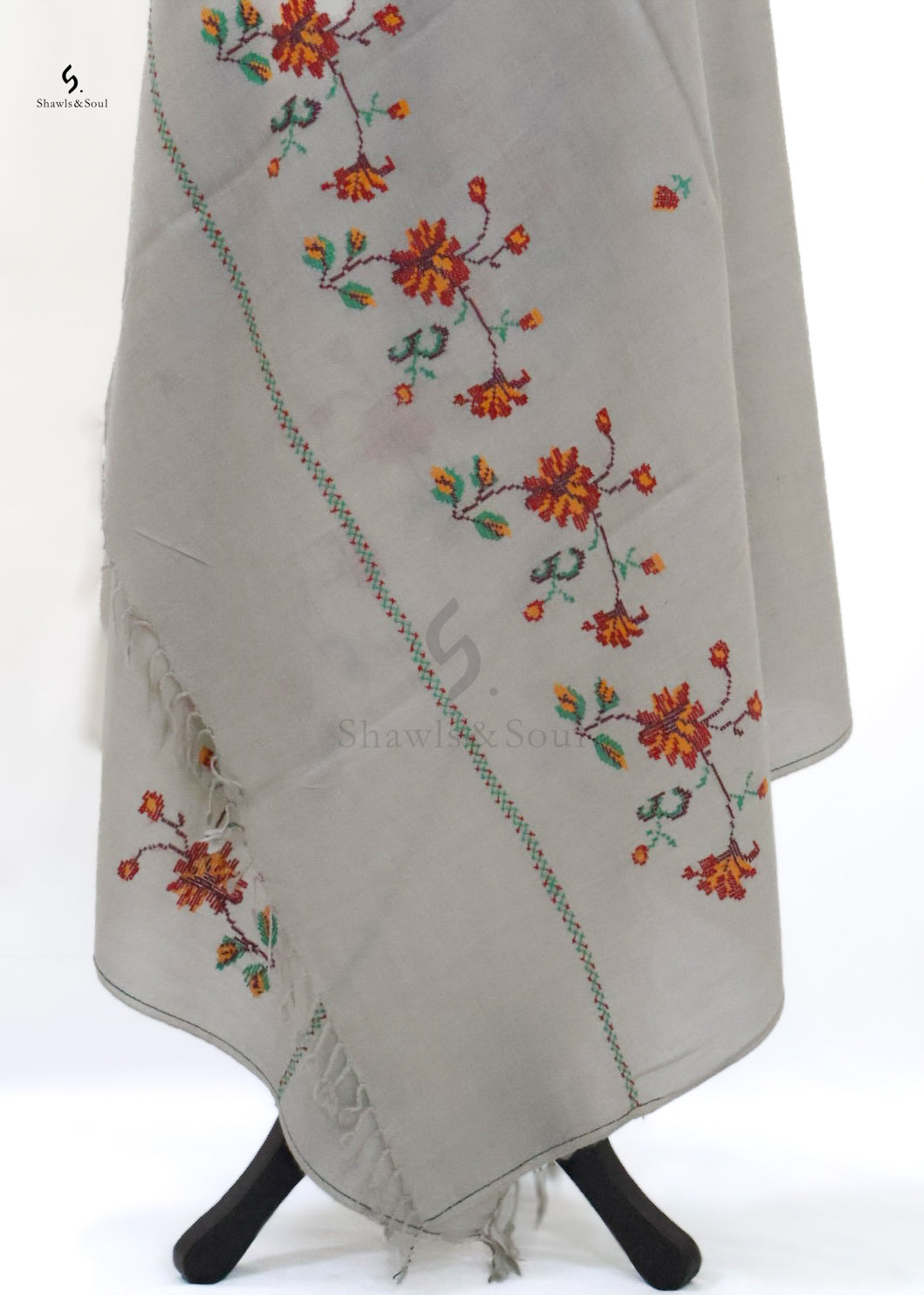 Amber Shawl showcases exquisite cross stitch embroidery delicately crafted with premium wool. This elegant piece blends artistry and quality, offering a beautiful design that enhances your collection without exceeding your budget. Ideal for those who appreciate refined craftsmanship and timeless appeal.
