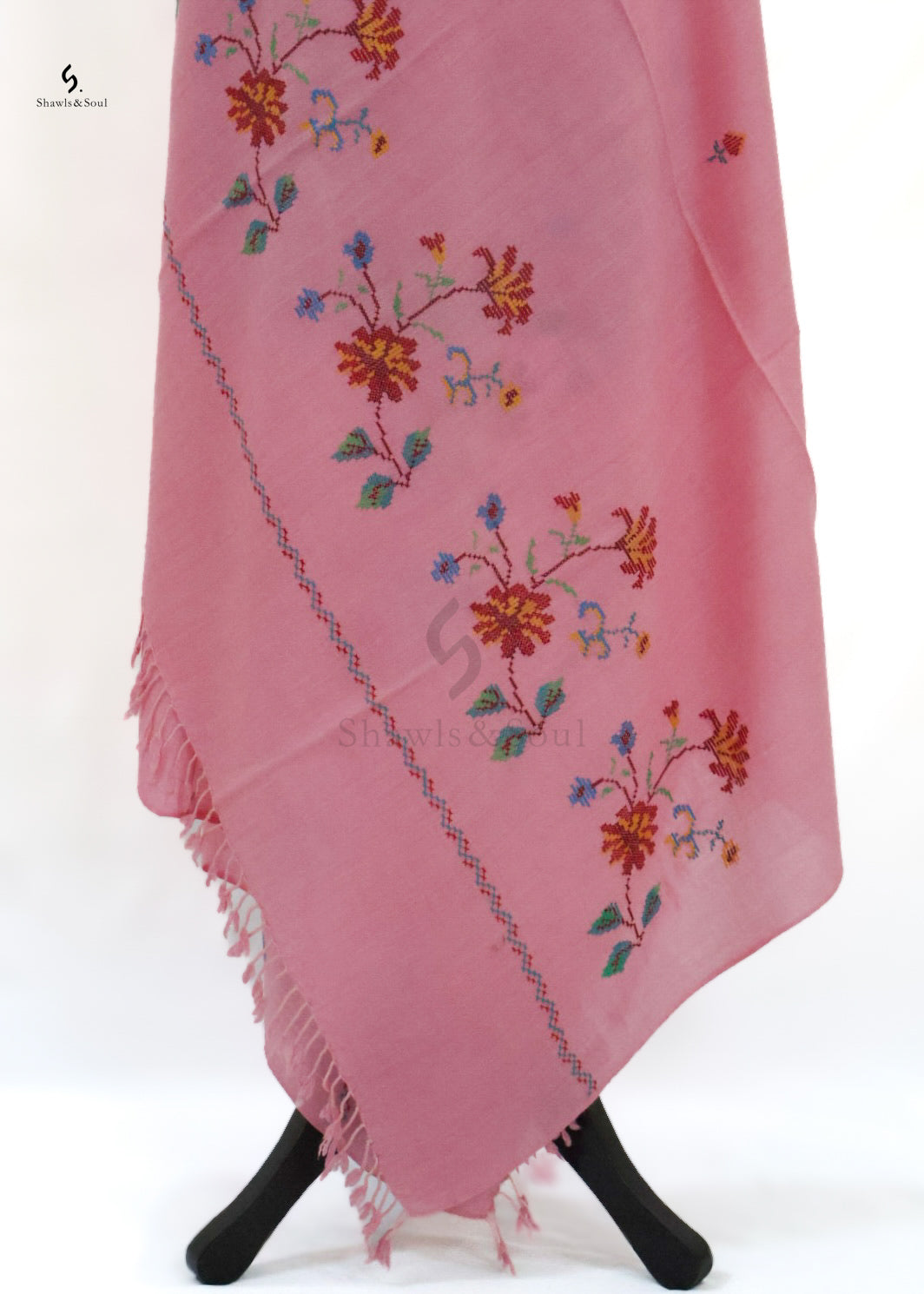 Amber Shawl showcases exquisite cross stitch embroidery delicately crafted with premium wool. This elegant piece blends artistry and quality, offering a beautiful design that enhances your collection without exceeding your budget. Ideal for those who appreciate refined craftsmanship and timeless appeal.