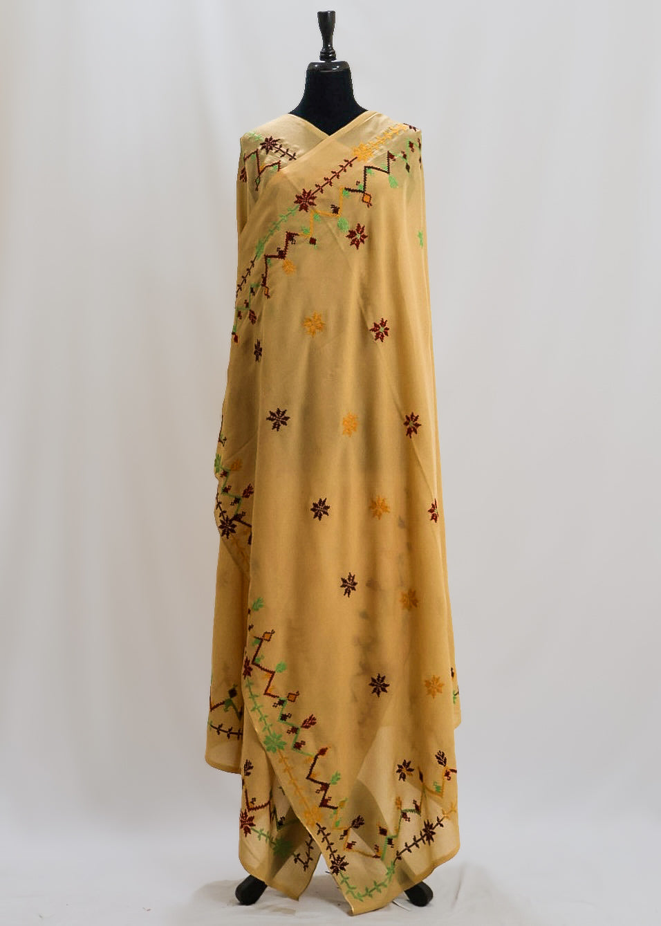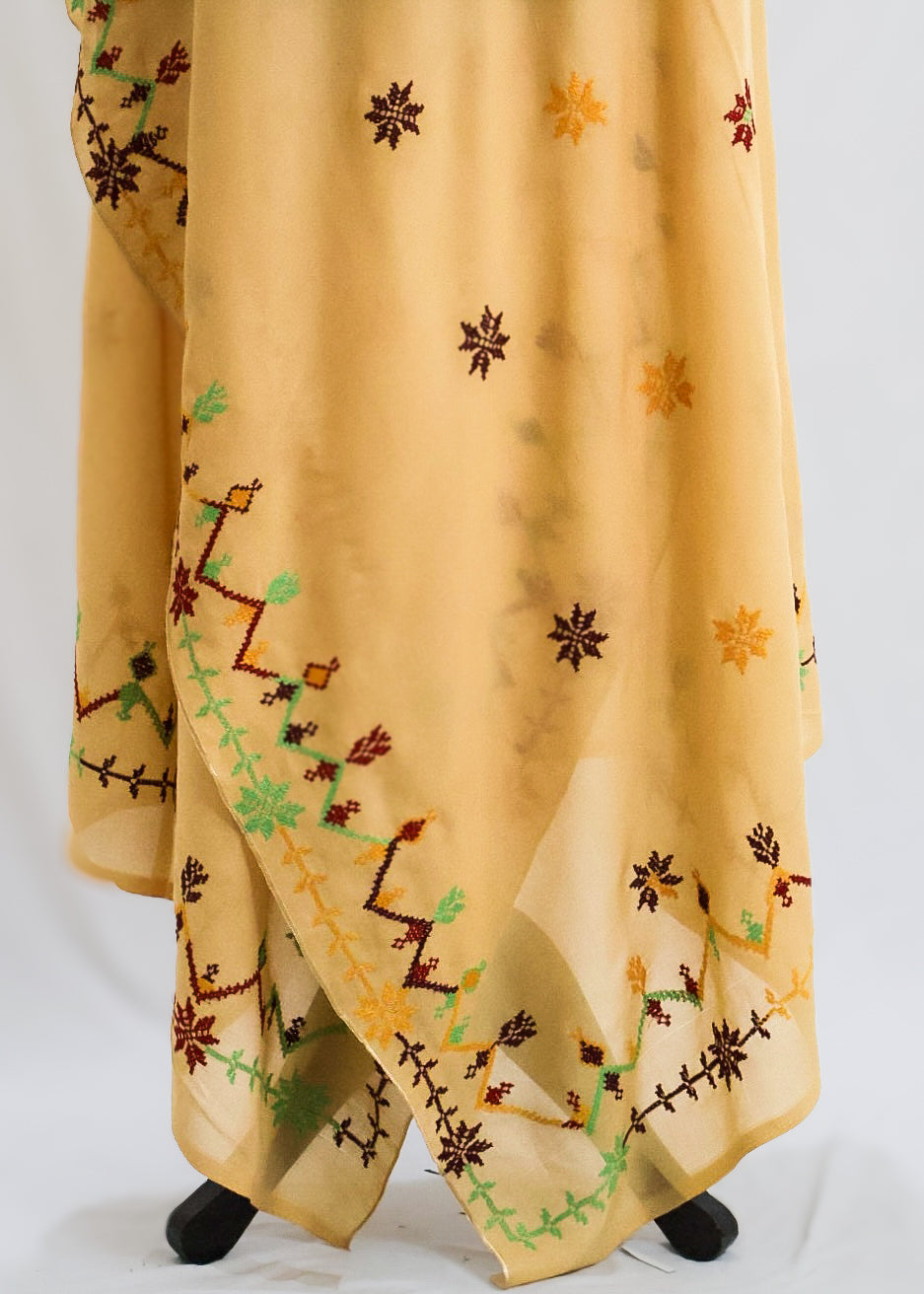 A soft and breezy white Swiss lawn shawl featuring vibrant cross-stitch embroidery in floral and geometric patterns. Handcrafted with care, it adds a pop of tradition to your summer wardrobe with a light, airy feel.