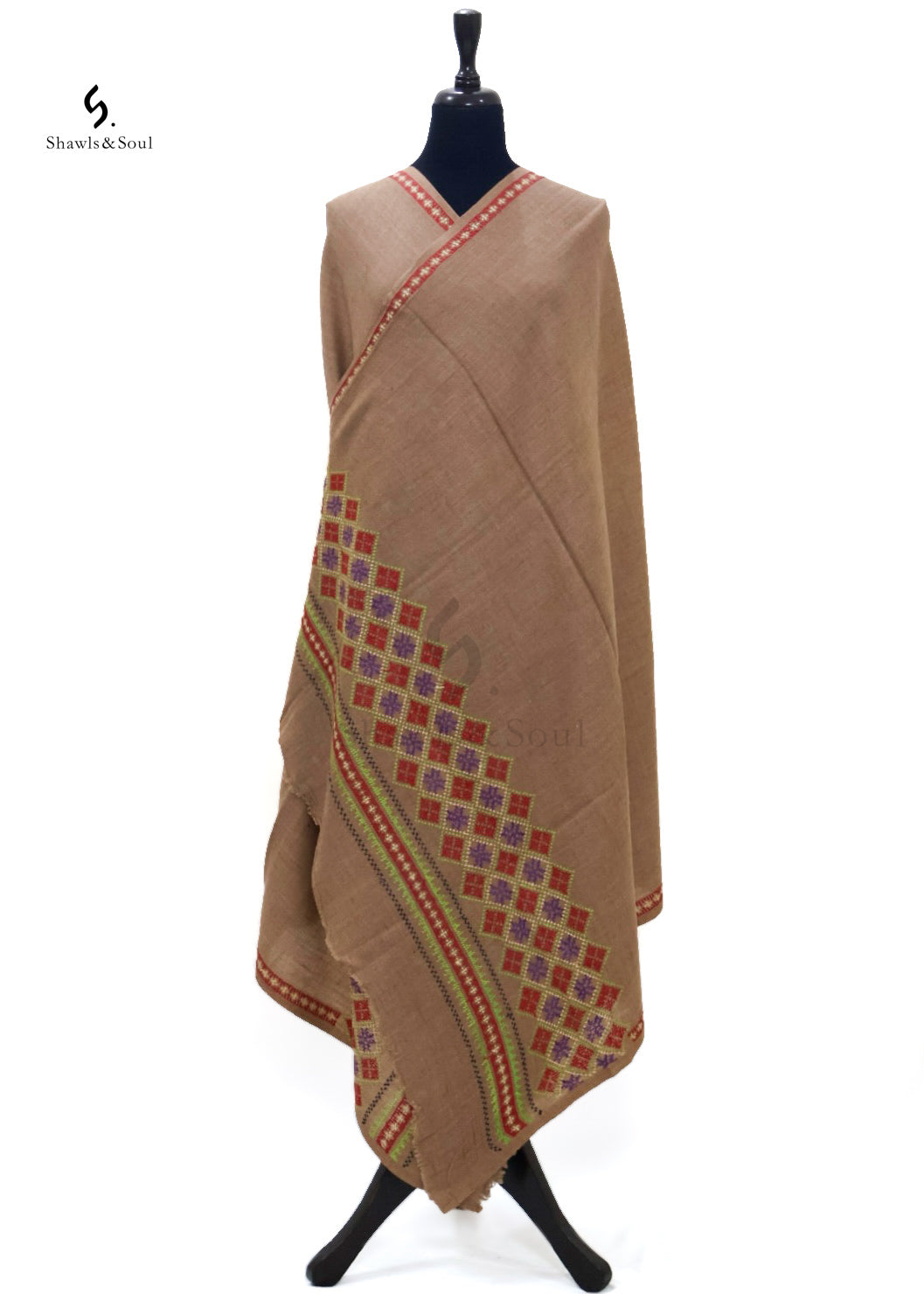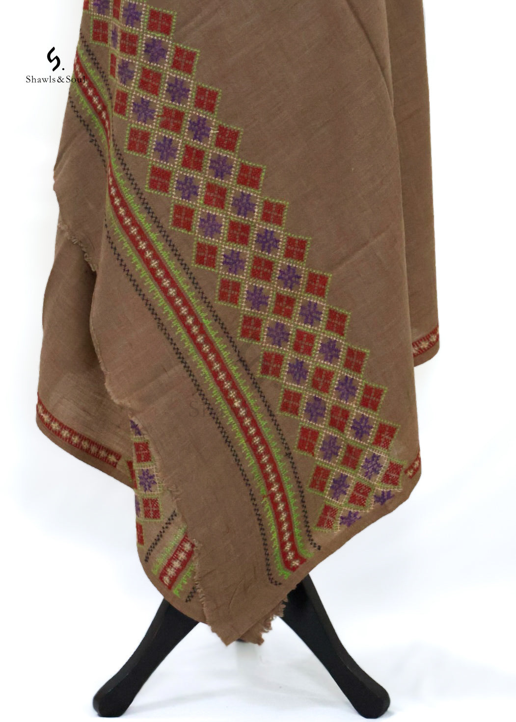 Elevate your winter wardrobe with the Crossed Elegance A shawl, crafted from premium wool for warmth and durability. Featuring intricate cross-stitch embroidery, this woolen shawl combines classic artistry with a refined touch, offering both comfort and timeless style during colder seasons.