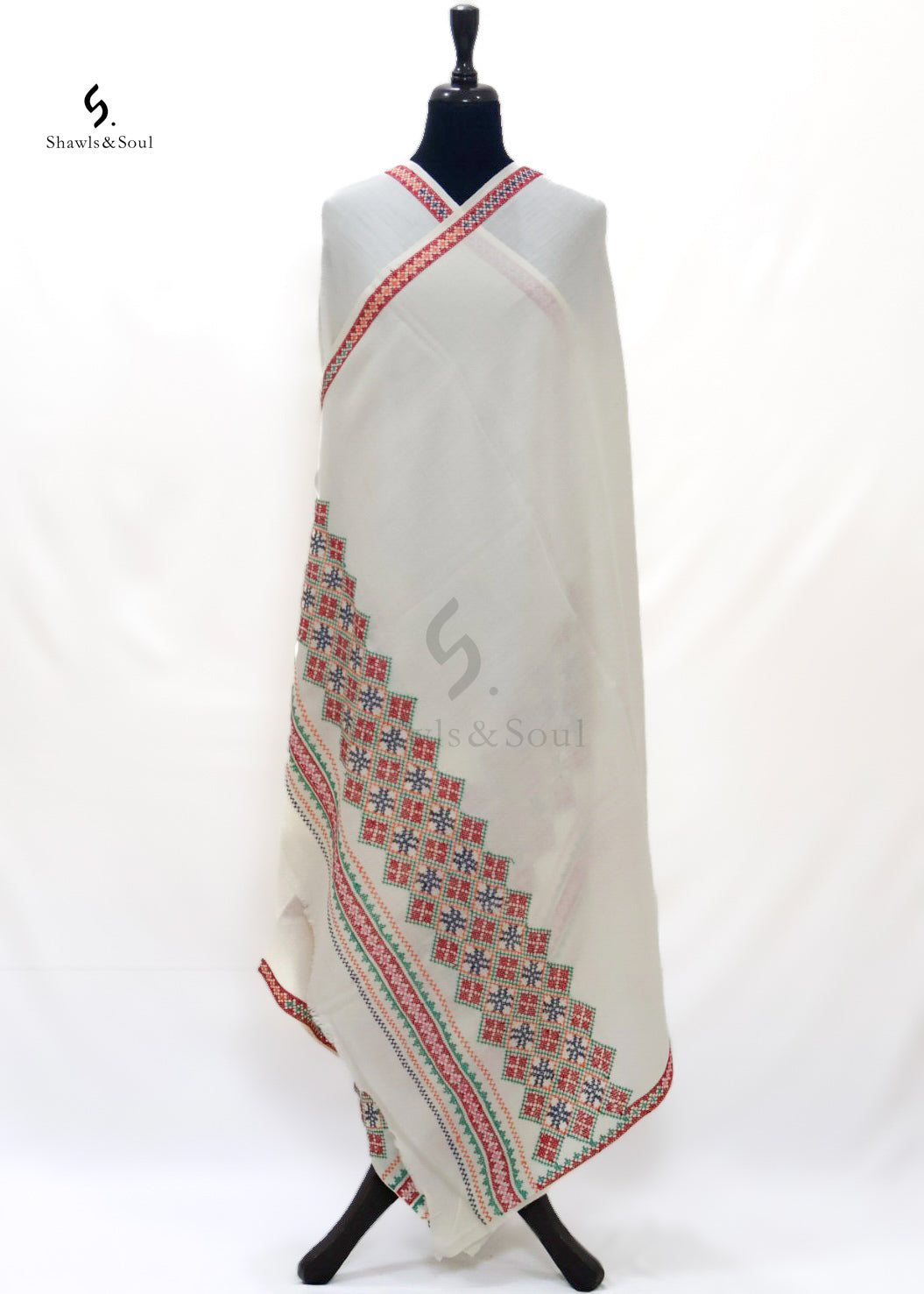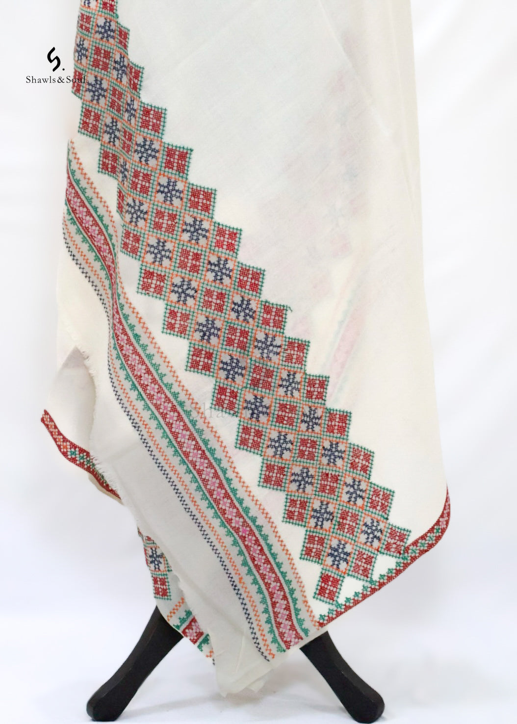 Elevate your winter wardrobe with the Crossed Elegance A shawl, crafted from premium wool for warmth and durability. Featuring intricate cross-stitch embroidery, this woolen shawl combines classic artistry with a refined touch, offering both comfort and timeless style during colder seasons.