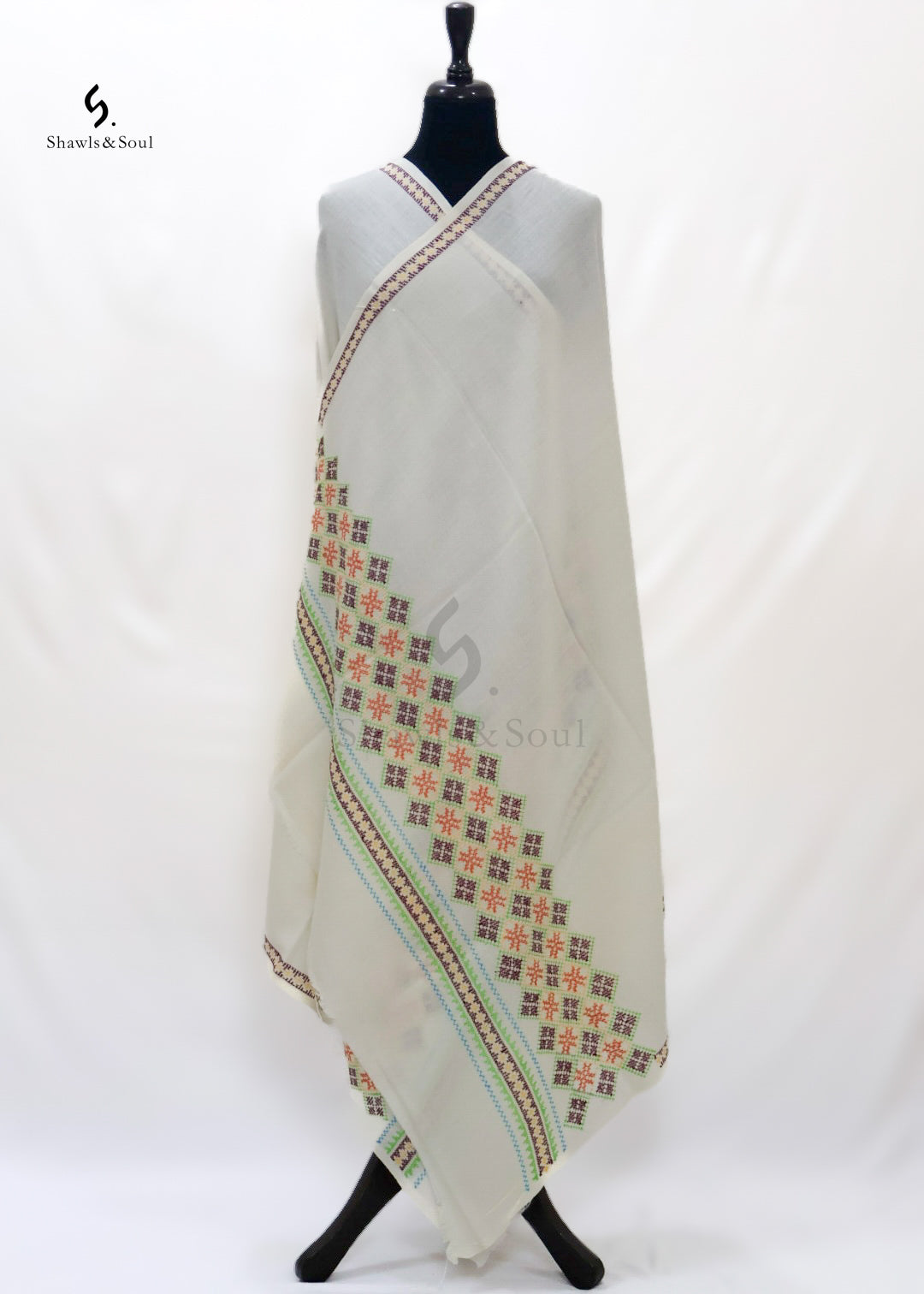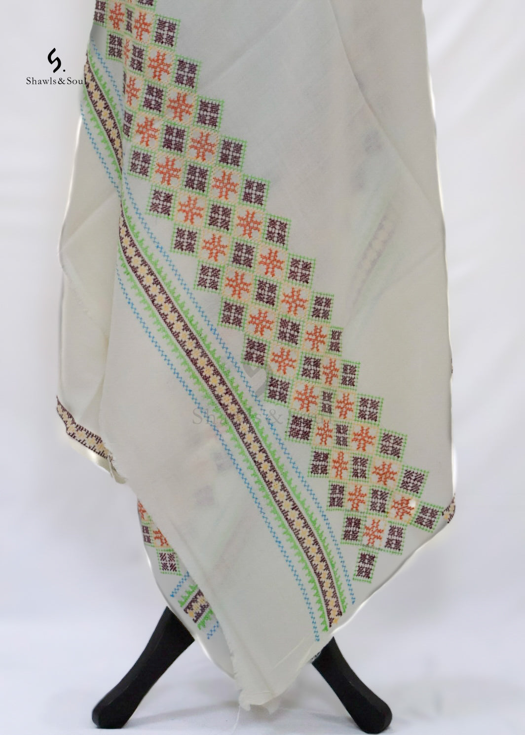 Elevate your winter wardrobe with the Crossed Elegance A shawl, crafted from premium wool for warmth and durability. Featuring intricate cross-stitch embroidery, this woolen shawl combines classic artistry with a refined touch, offering both comfort and timeless style during colder seasons.