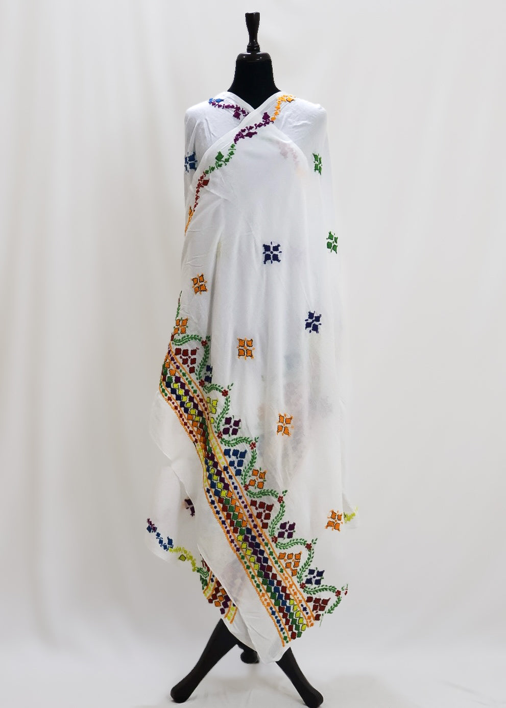 Introducing Ember White, a luxurious summer dupatta handcrafted with delicate Balochi embroidery on soft lawn fabric.
