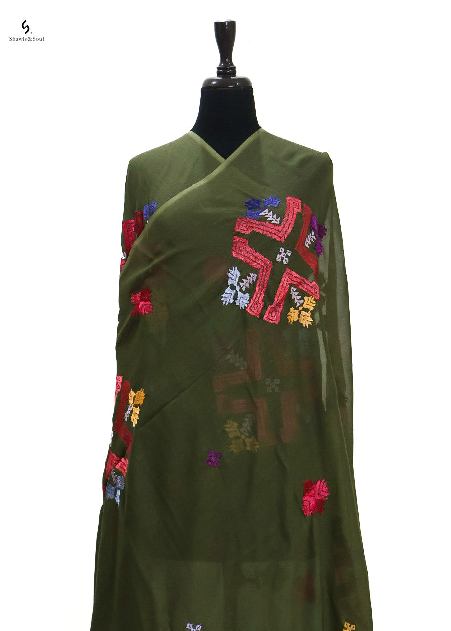 Introducing Gul-e-Swat, the epitome of luxury and sophistication. This shawl features exquisite Swati phulkari hand embroidery, bringing the rich and vibrant culture of the Swat to your wardrobe. Wrap yourself in elegance and style with this one-of-a-kind piece.