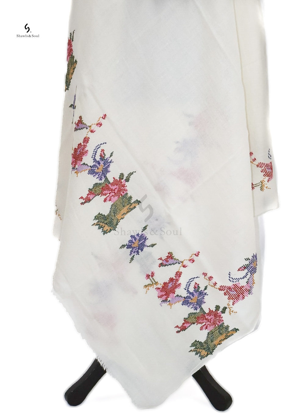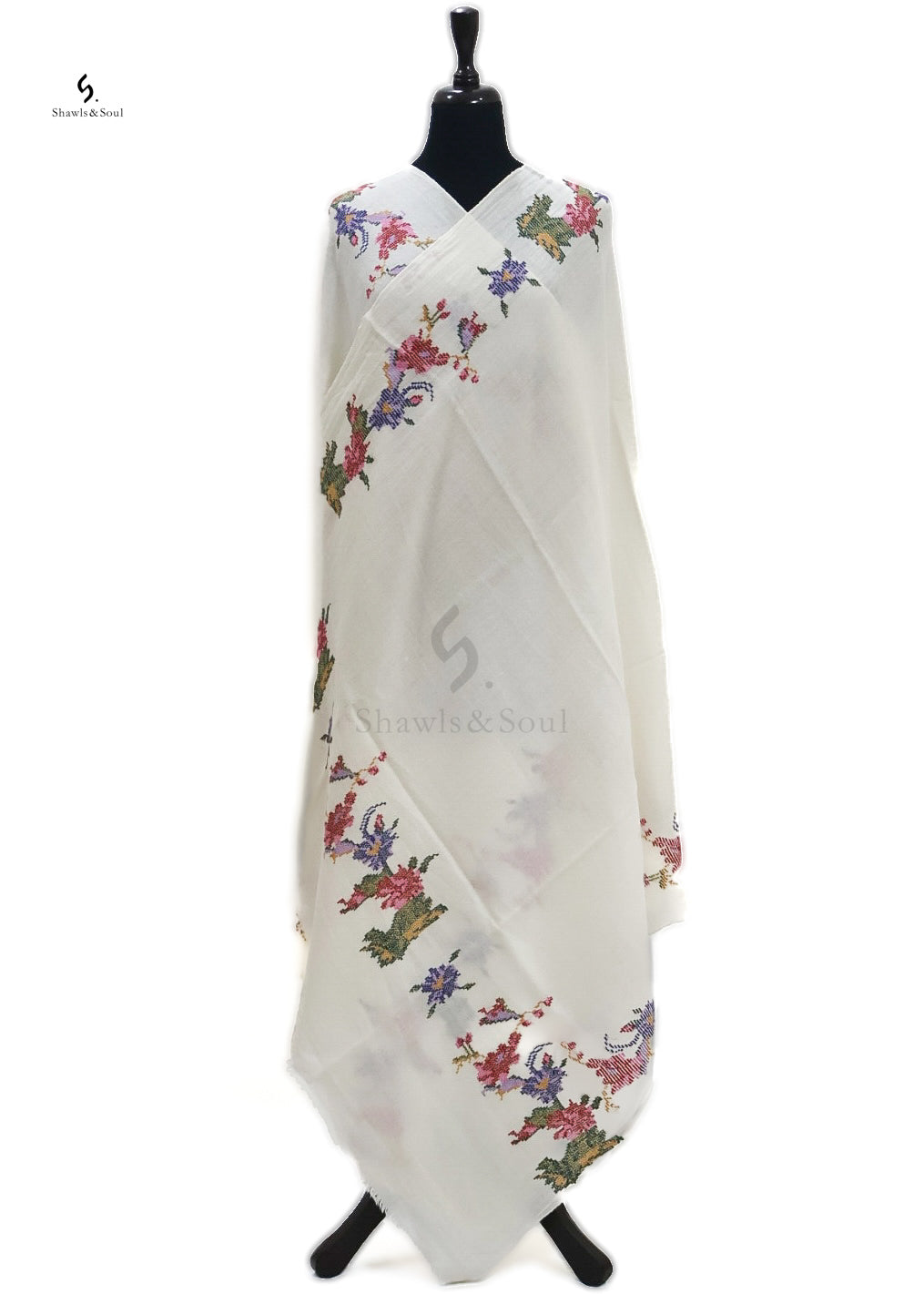 The Meher Bano winter shawl is expertly woven from pure soft wool, offering exceptional warmth and comfort. Its elegant cross stitch embroidery highlights a graceful four-border floral pattern, making it a refined and stylish choice for sophisticated cold-weather dressing.