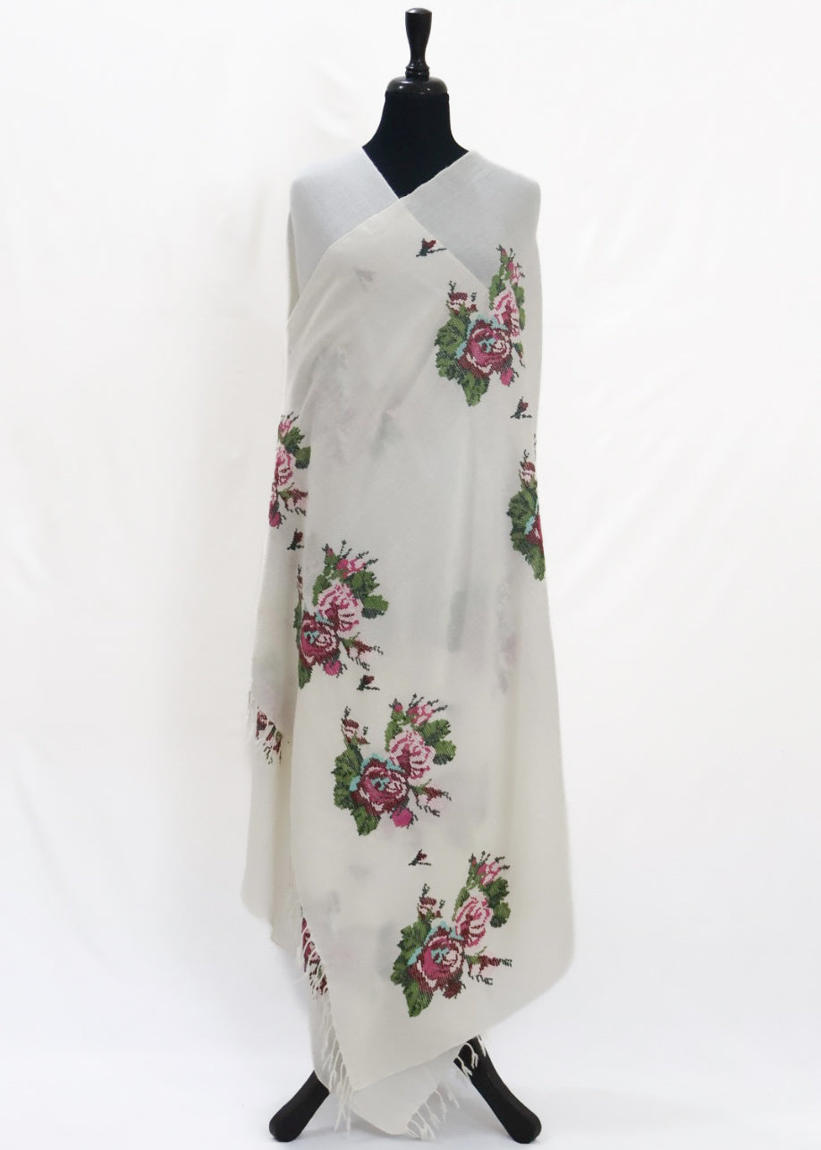 Crafted from the Pure 72 Wool, this elegant black shawl features intricate cross stitch embroidery in floral patterns, blending timeless tradition with modern sophistication.