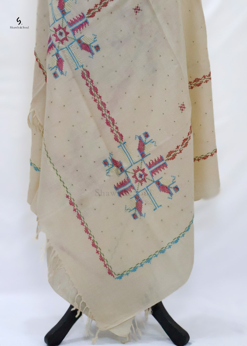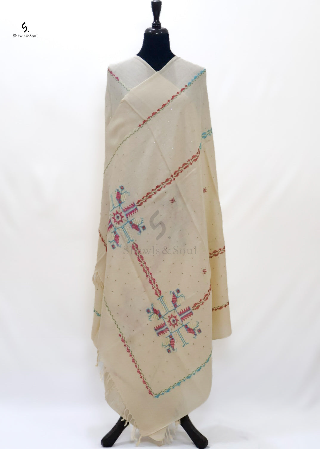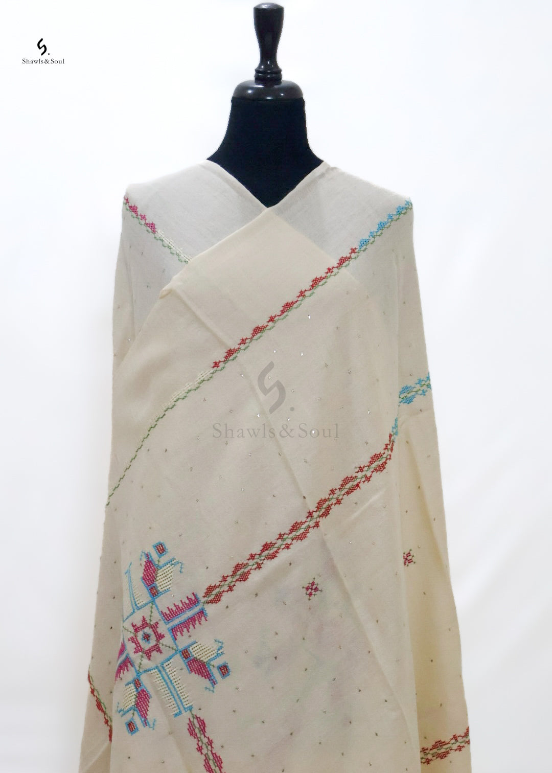 Crafted from wool, Mukesh Blossom showcases intricate hand embroidery that combines delicate Mukesh and refined Cross Stitch techniques. Enhanced with four elegantly designed borders, this piece offers a timeless statement of craftsmanship and style, perfect for those who appreciate sophisticated artistry in their wardrobe.