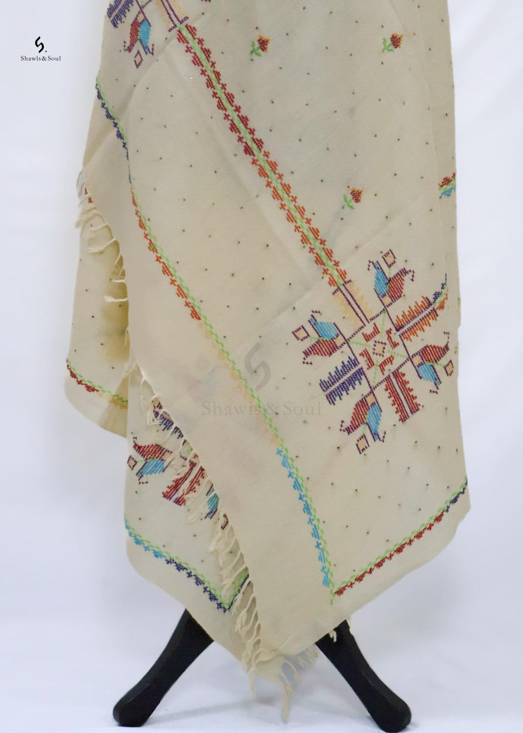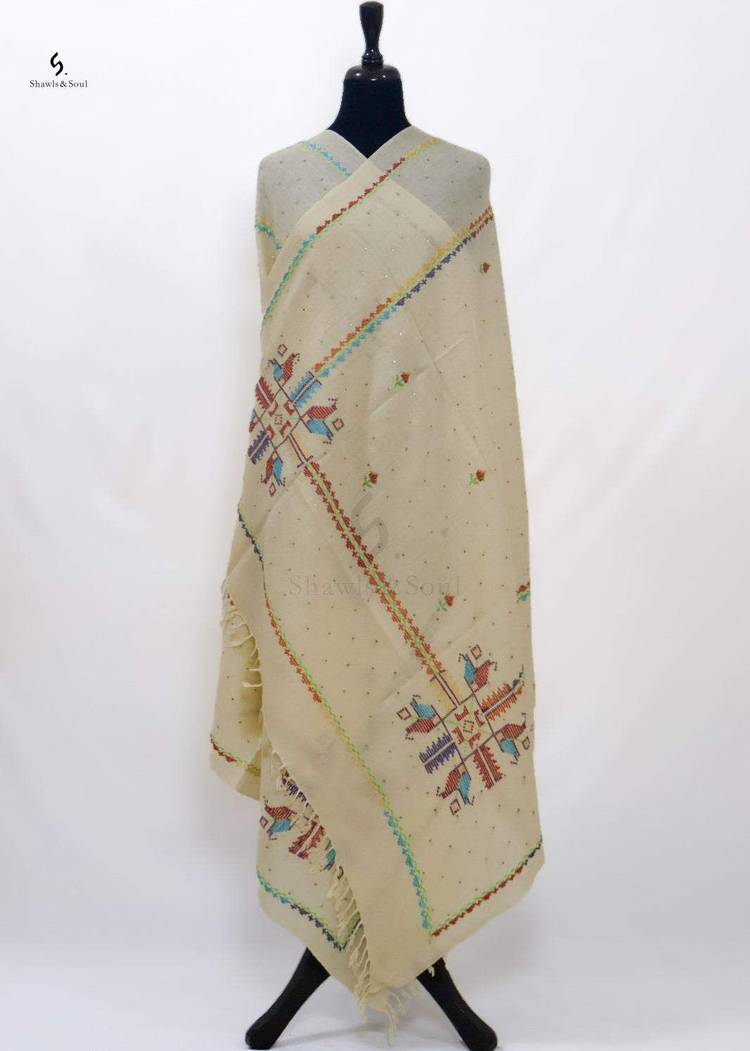 Crafted from wool, Mukesh Blossom showcases intricate hand embroidery that combines delicate Mukesh and refined Cross Stitch techniques. Enhanced with four elegantly designed borders, this piece offers a timeless statement of craftsmanship and style, perfect for those who appreciate sophisticated artistry in their wardrobe.