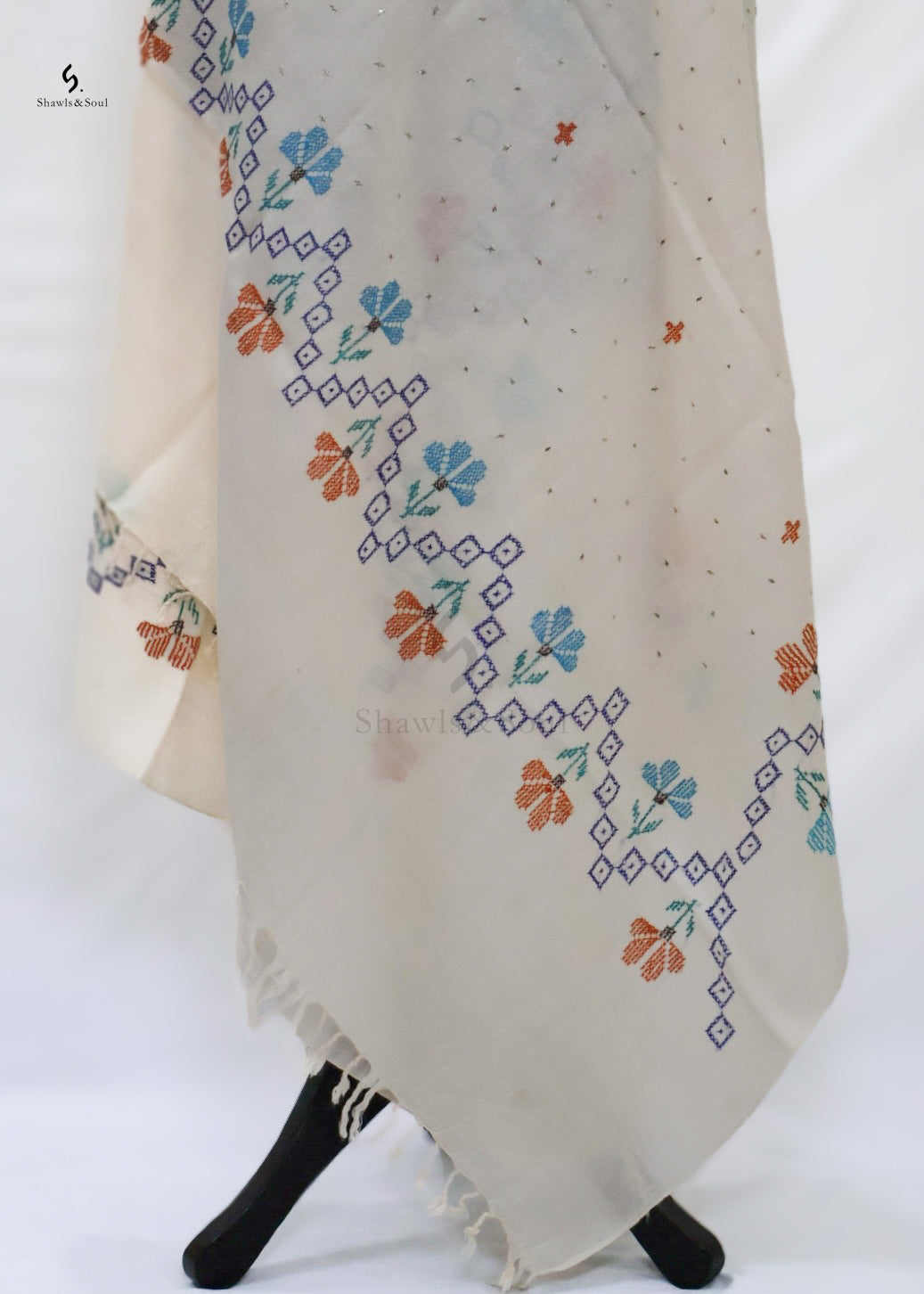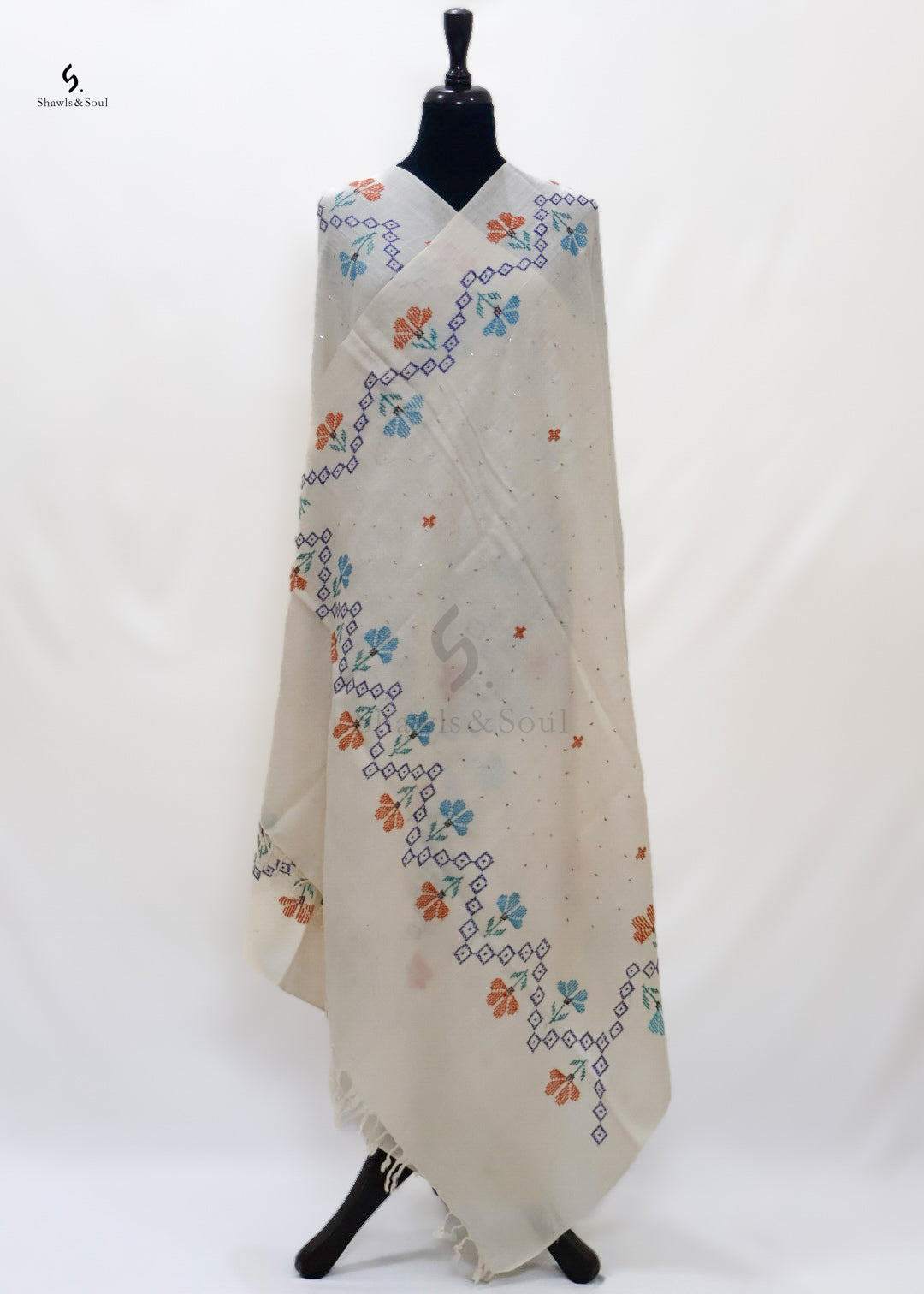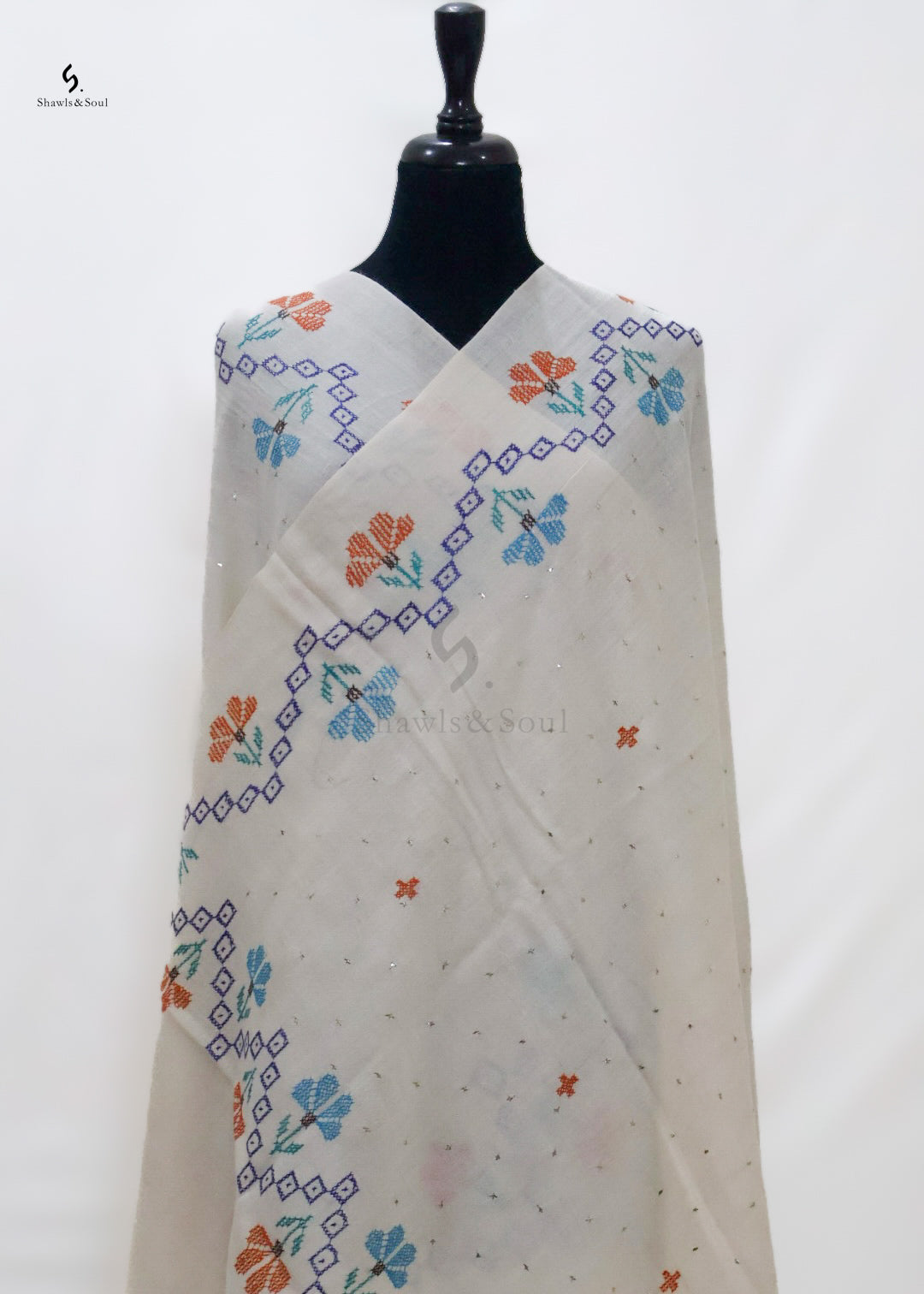 Crafted from wool, Mukesh Blossom showcases intricate hand embroidery that combines delicate Mukesh and refined Cross Stitch techniques. Enhanced with four elegantly designed borders, this piece offers a timeless statement of craftsmanship and style, perfect for those who appreciate sophisticated artistry in their wardrobe.