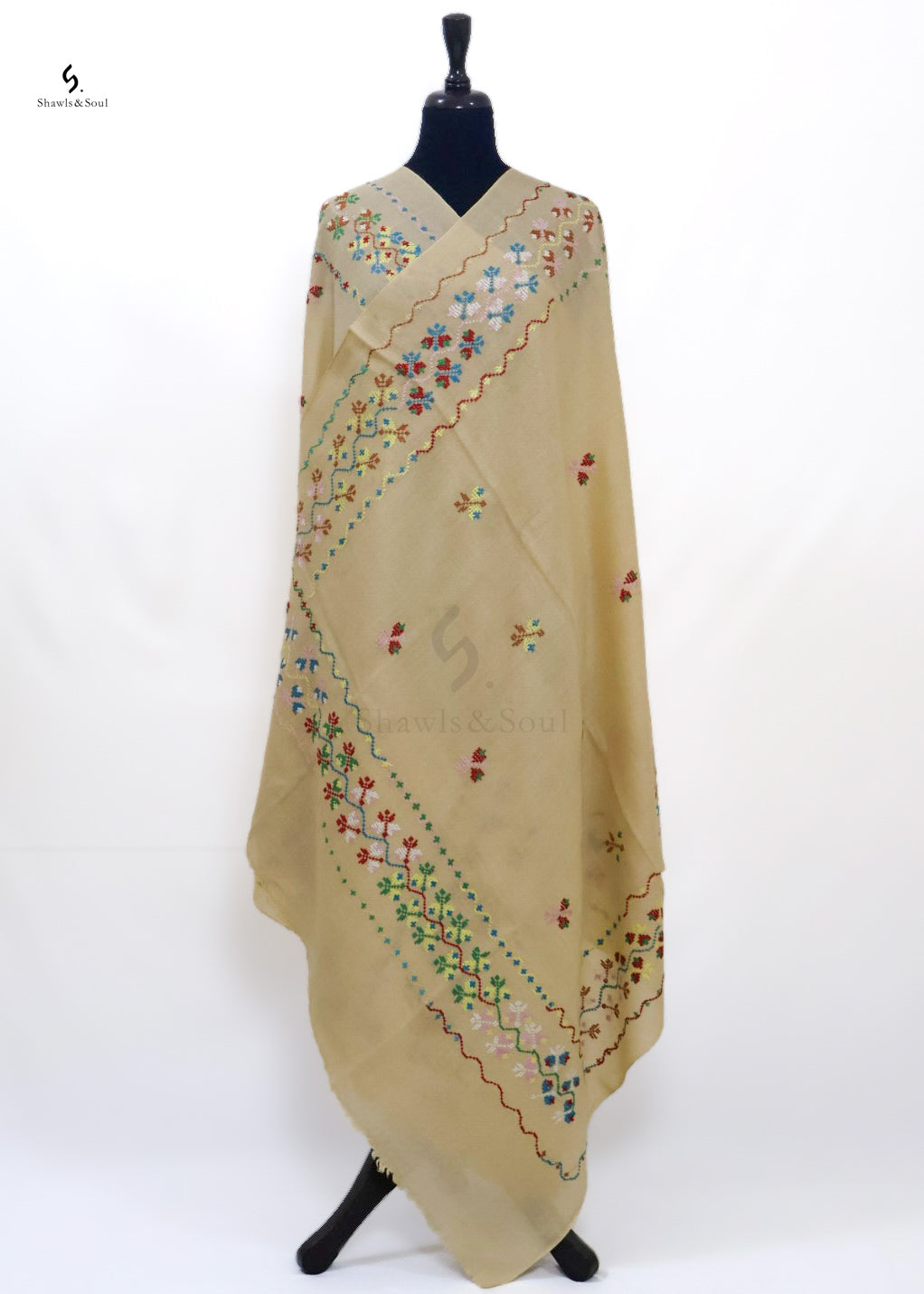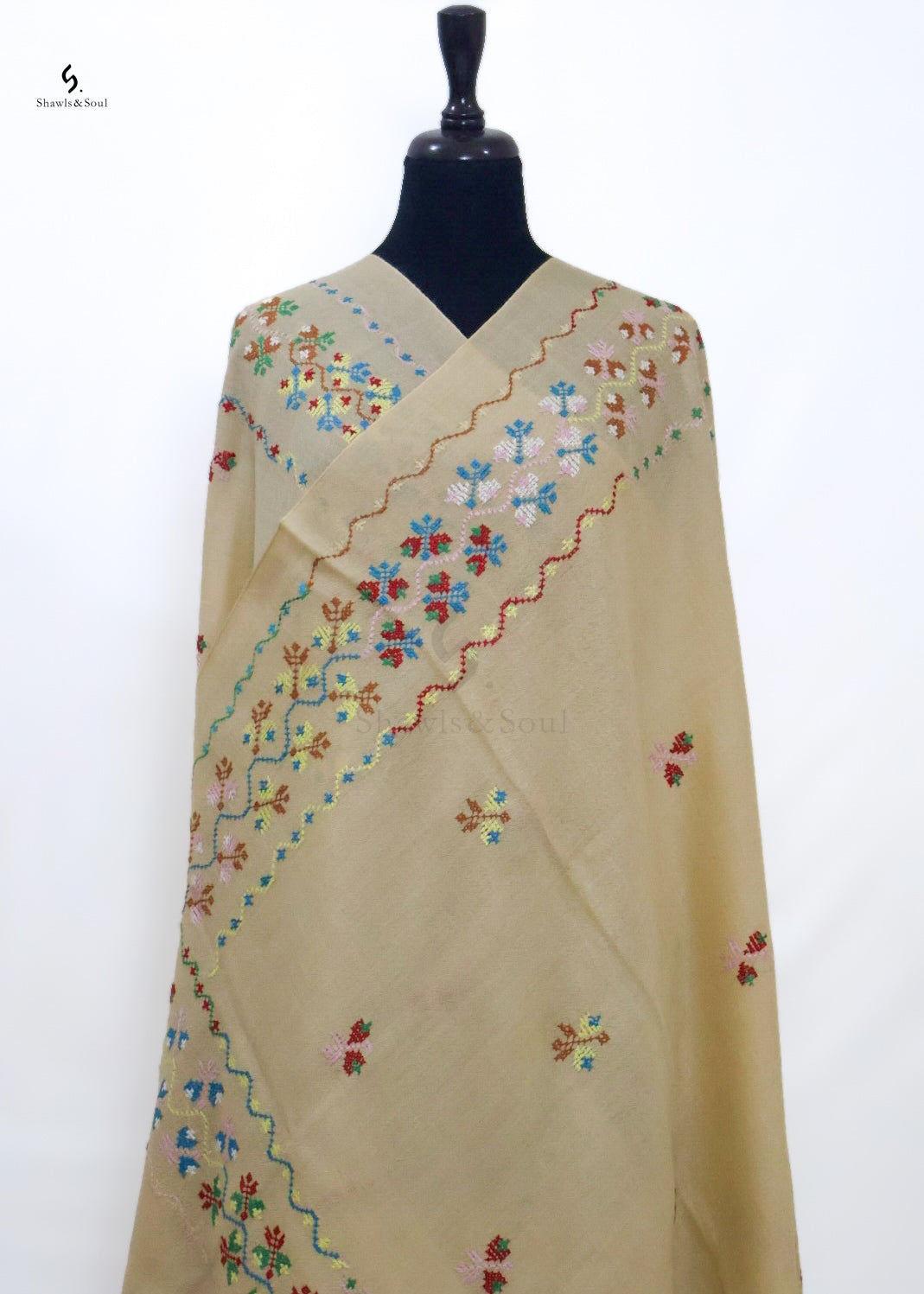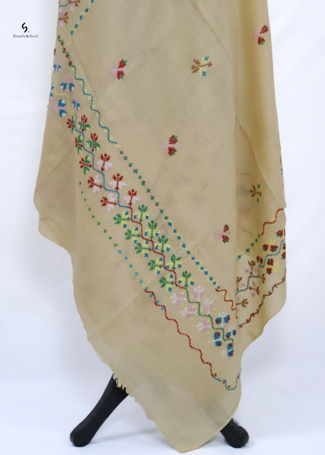 Crafted from fine wool, Naqsh features an elegant cross stitch design along all four borders, marrying traditional artistry with luxurious texture. Its detailed embroidery adds a refined touch, making it an exquisite accessory for sophisticated style and comfort.