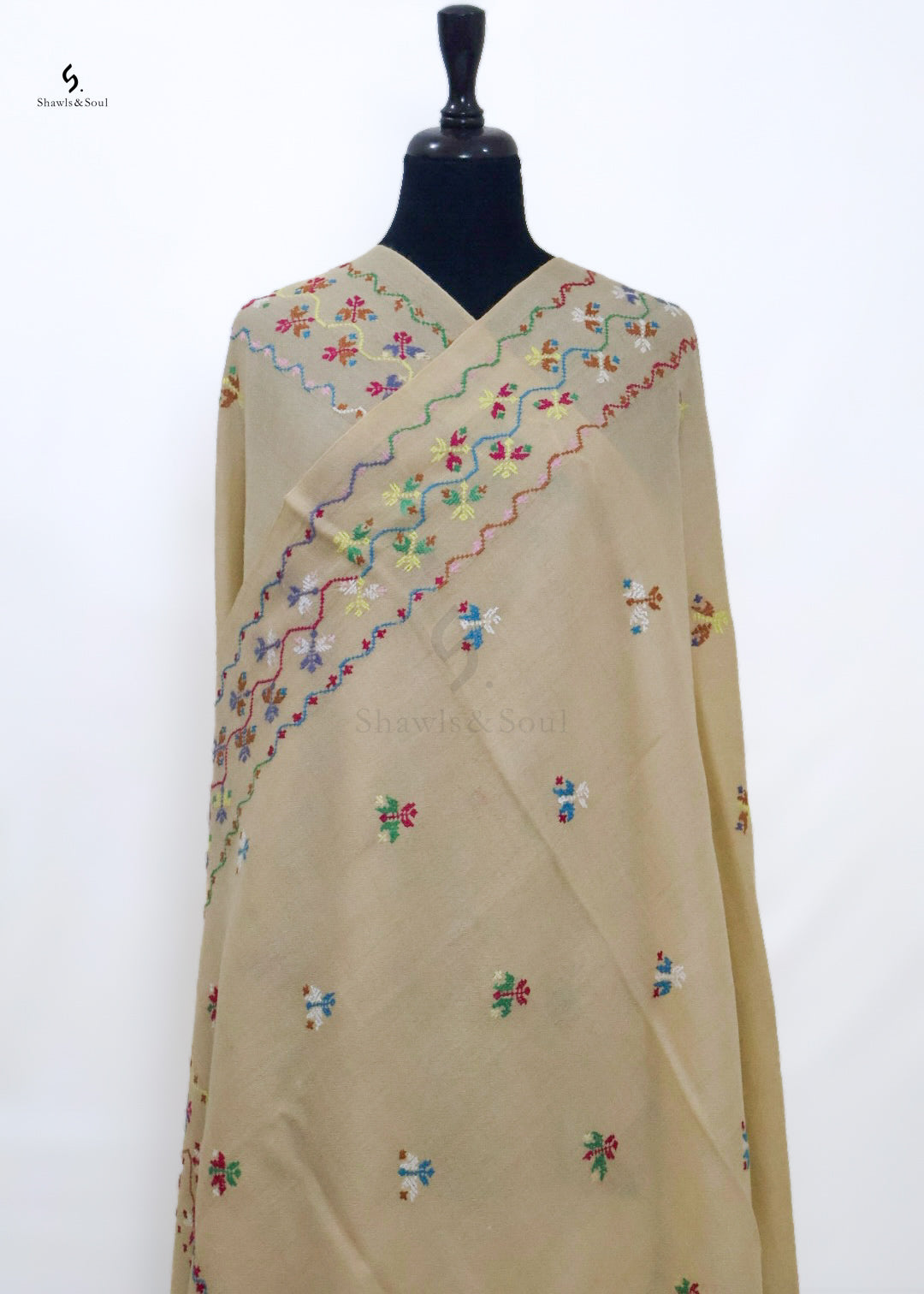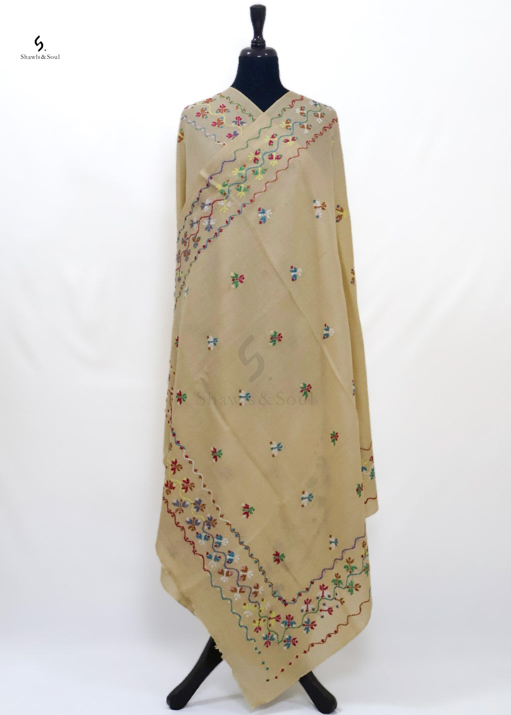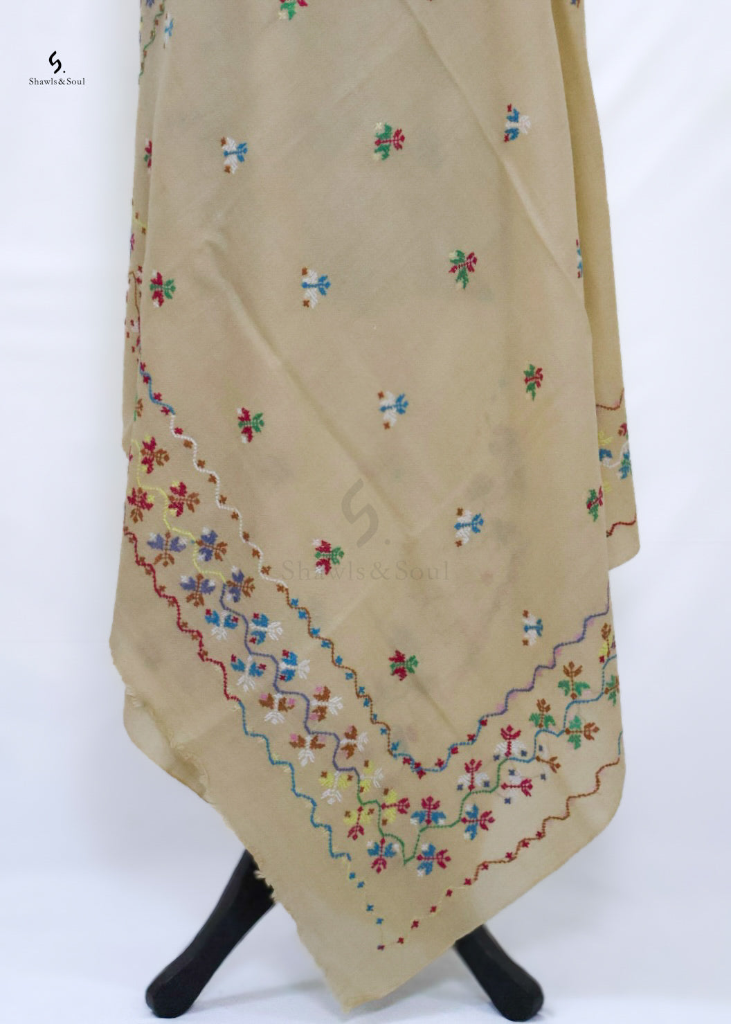 Crafted from fine wool, Gula features an elegant cross stitch design along all four borders, marrying traditional artistry with luxurious texture. Its detailed embroidery adds a refined touch, making it an exquisite accessory for sophisticated style and comfort.