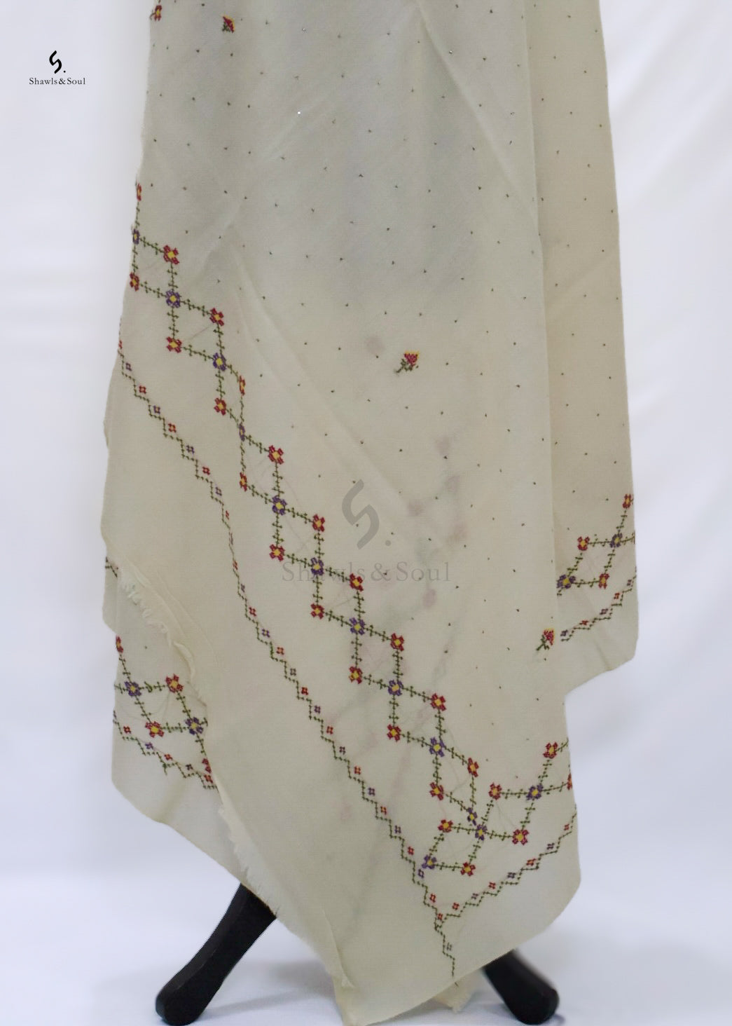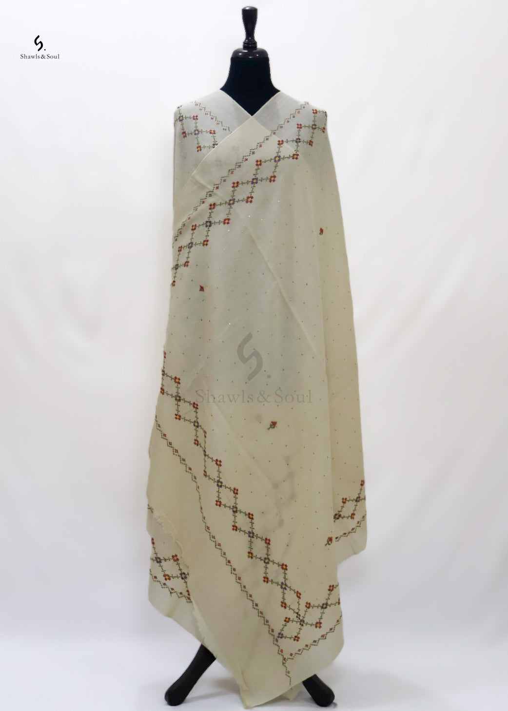 Crafted from wool, Mukesh Blossom showcases intricate hand embroidery that combines delicate Mukesh and refined Cross Stitch techniques. Enhanced with four elegantly designed borders, this piece offers a timeless statement of craftsmanship and style, perfect for those who appreciate sophisticated artistry in their wardrobe.