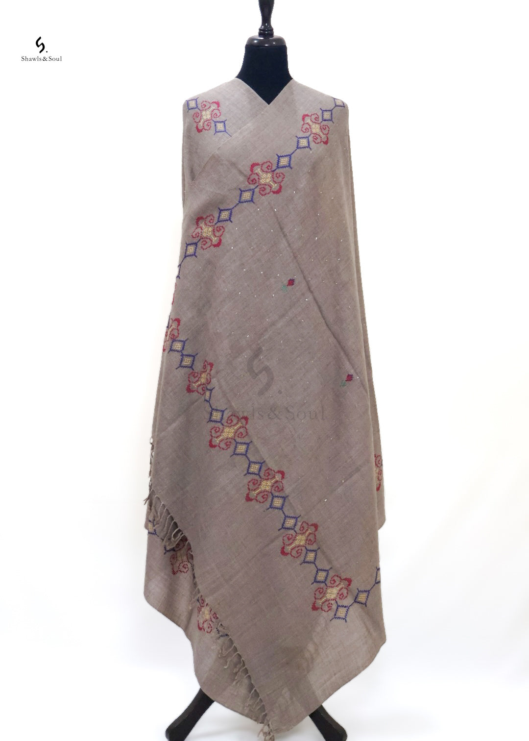 Crafted from wool, Mukesh Royal showcases intricate hand embroidery that combines delicate Mukesh and refined Cross Stitch techniques. Enhanced with four elegantly designed borders, this piece offers a timeless statement of craftsmanship and style, perfect for those who appreciate sophisticated artistry in their wardrobe.