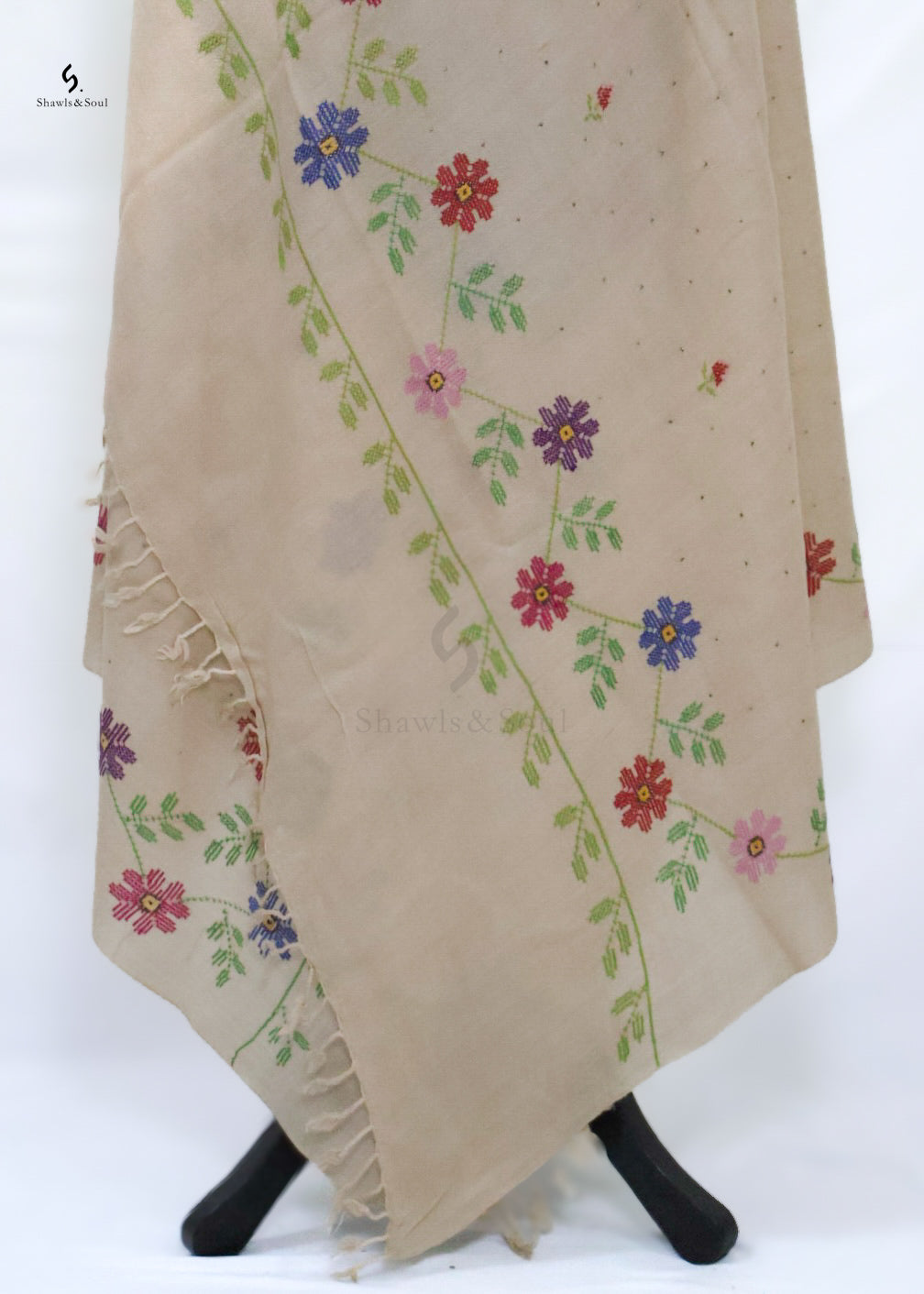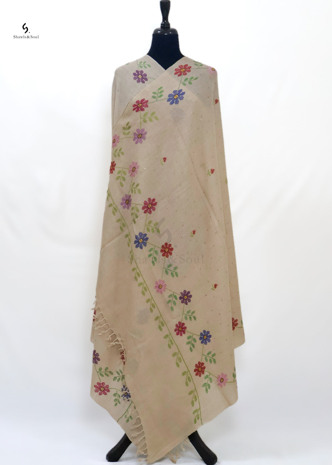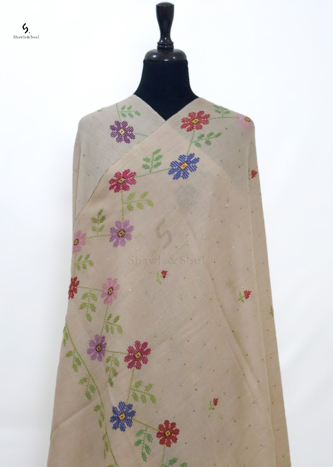 Crafted from wool, Mukesh Royal showcases intricate hand embroidery that combines delicate Mukesh and refined Cross Stitch techniques. Enhanced with four elegantly designed borders, this piece offers a timeless statement of craftsmanship and style, perfect for those who appreciate sophisticated artistry in their wardrobe.