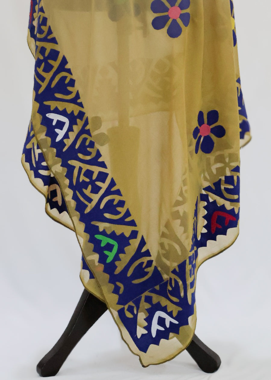 Introducing the Noori summer shawl, featuring delicate applique embroidery on a single line design. Perfect for adding a touch of luxury to your summer wardrobe.