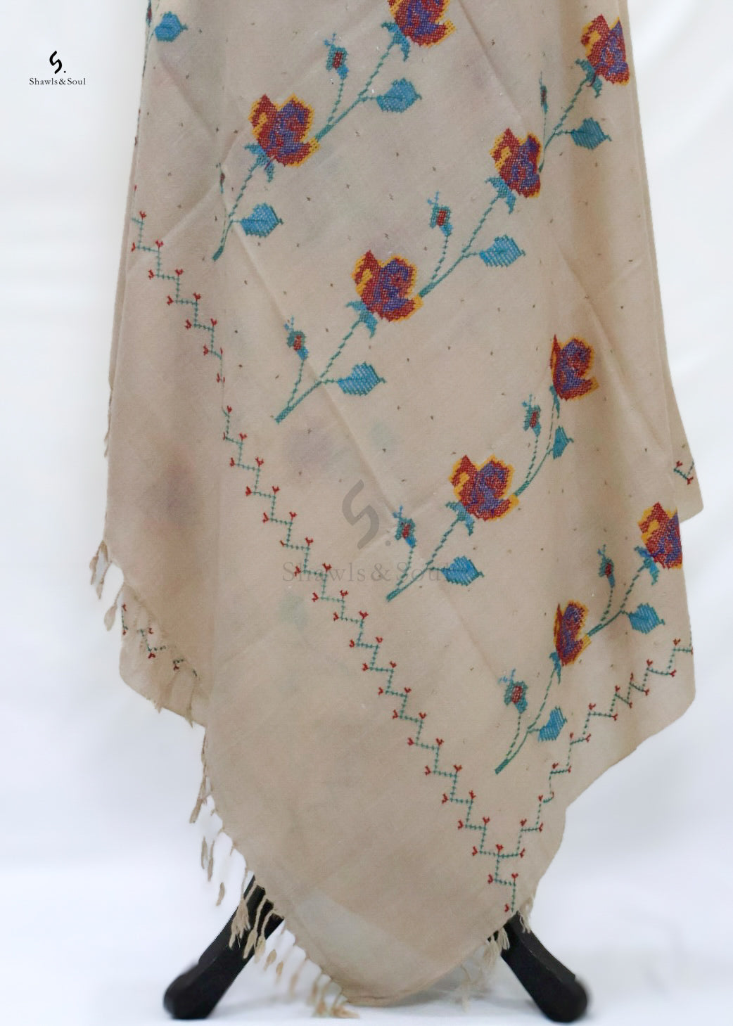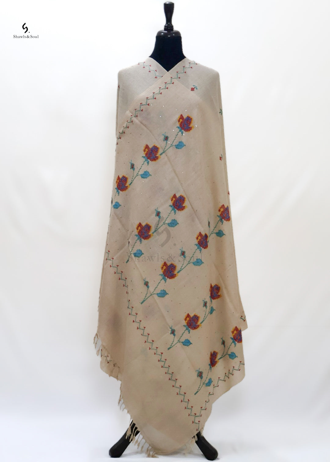 Elevate your ensemble with the Phooldan Mukesh, a woolen shawl exquisitely adorned with delicate cross stitch and shimmering mukesh embroidery. This sophisticated piece blends traditional craftsmanship with timeless elegance, offering both warmth and refined style for any occasion.
