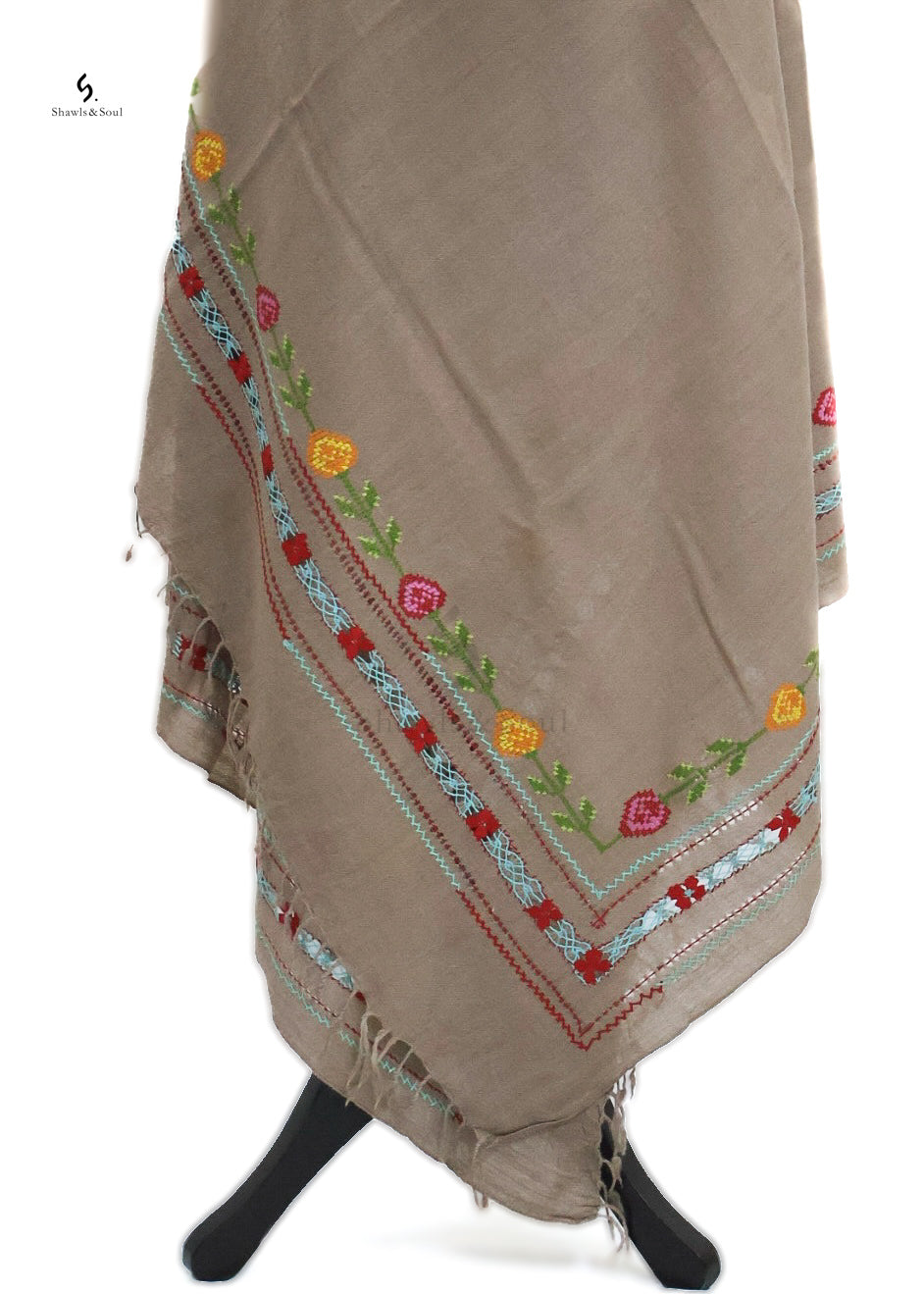 Experience refined elegance with the Pure Essence A shawl, crafted from pure wool for unmatched warmth and softness. This luxurious piece features intricate taarkashi and cross-stitch embroidery, adding depth and timeless beauty. Perfect for elevating any ensemble, it blends traditional artistry with modern sophistication.