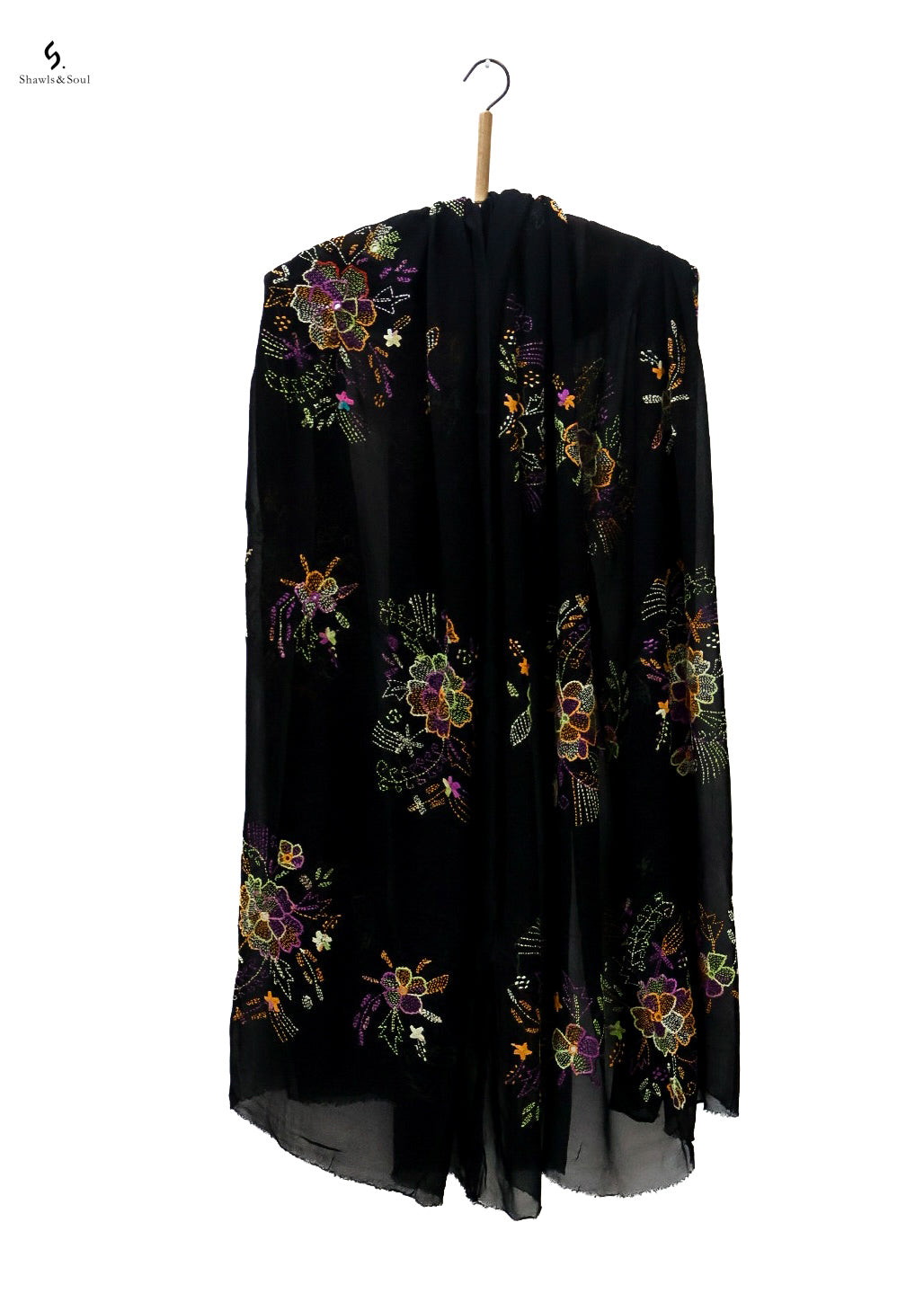 Elegant Chiffon dupatta adorned with delicate multi color hand embroidery. A timeless piece that exudes subtle luxury and refined grace.