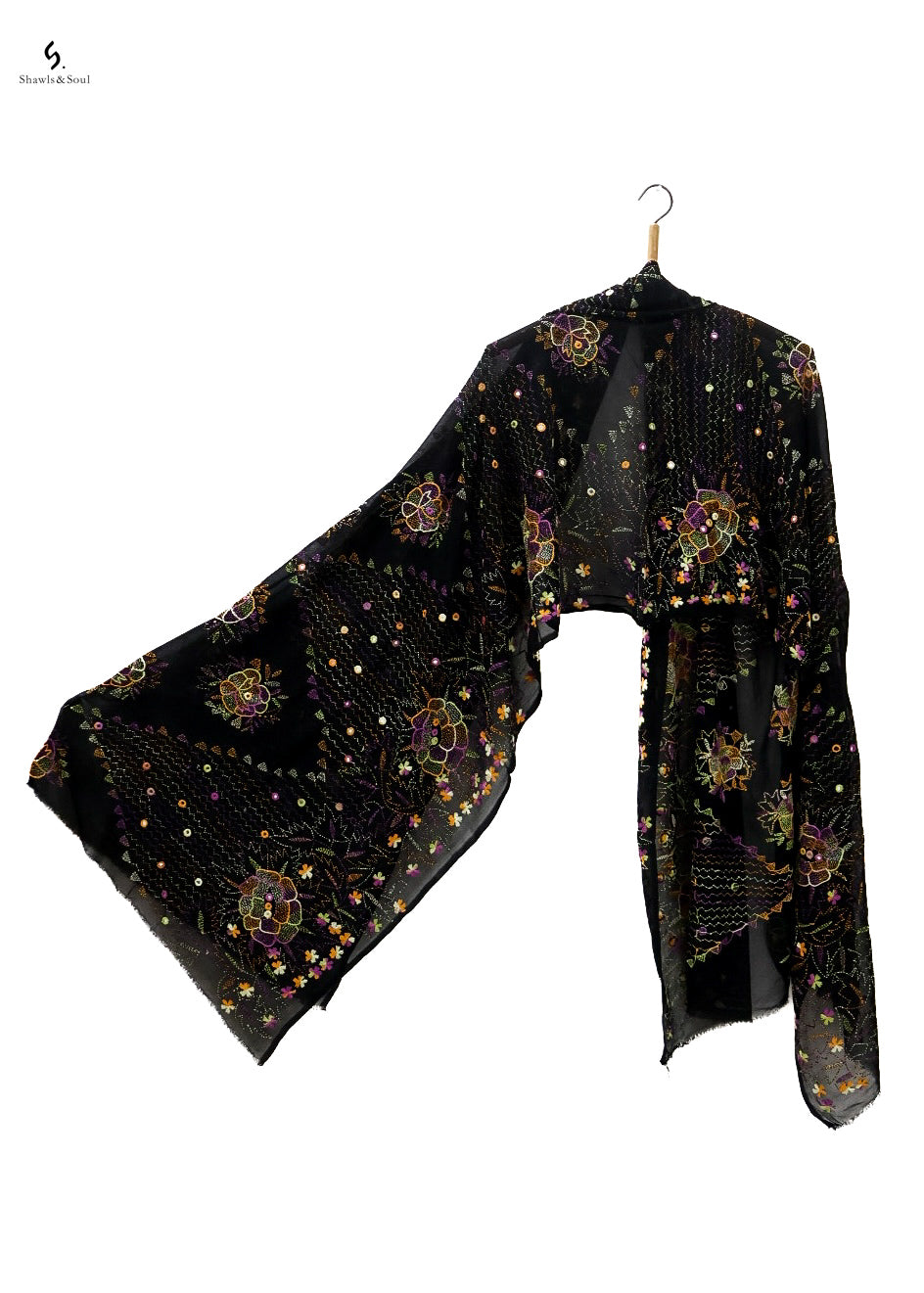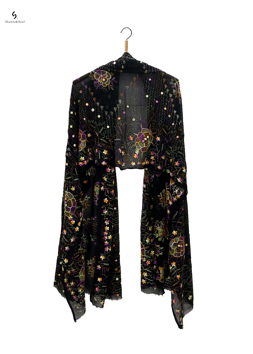 Elegant Chiffon dupatta adorned with delicate multi color hand embroidery. A timeless piece that exudes subtle luxury and refined grace.