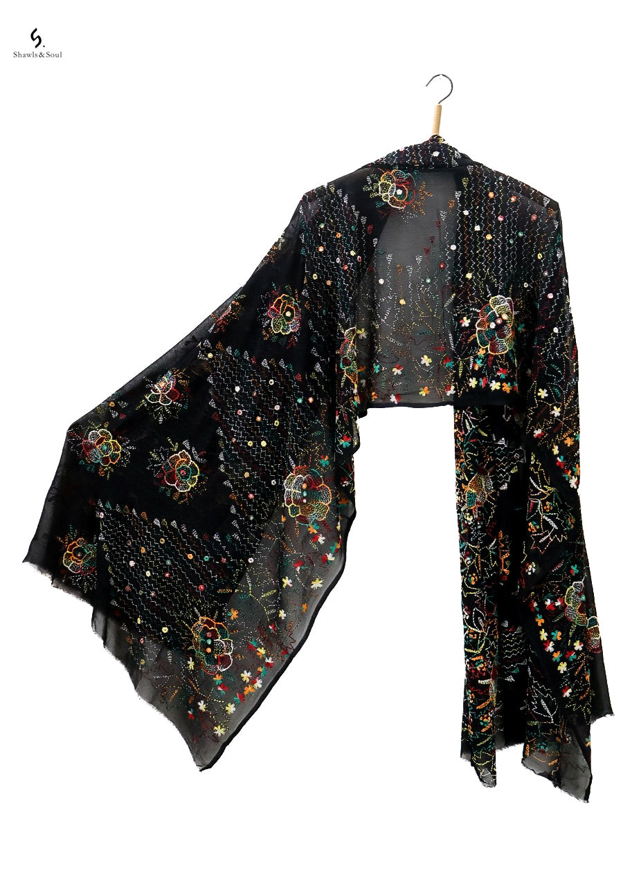 Elegant Chiffon dupatta adorned with delicate multi color hand embroidery. A timeless piece that exudes subtle luxury and refined grace.