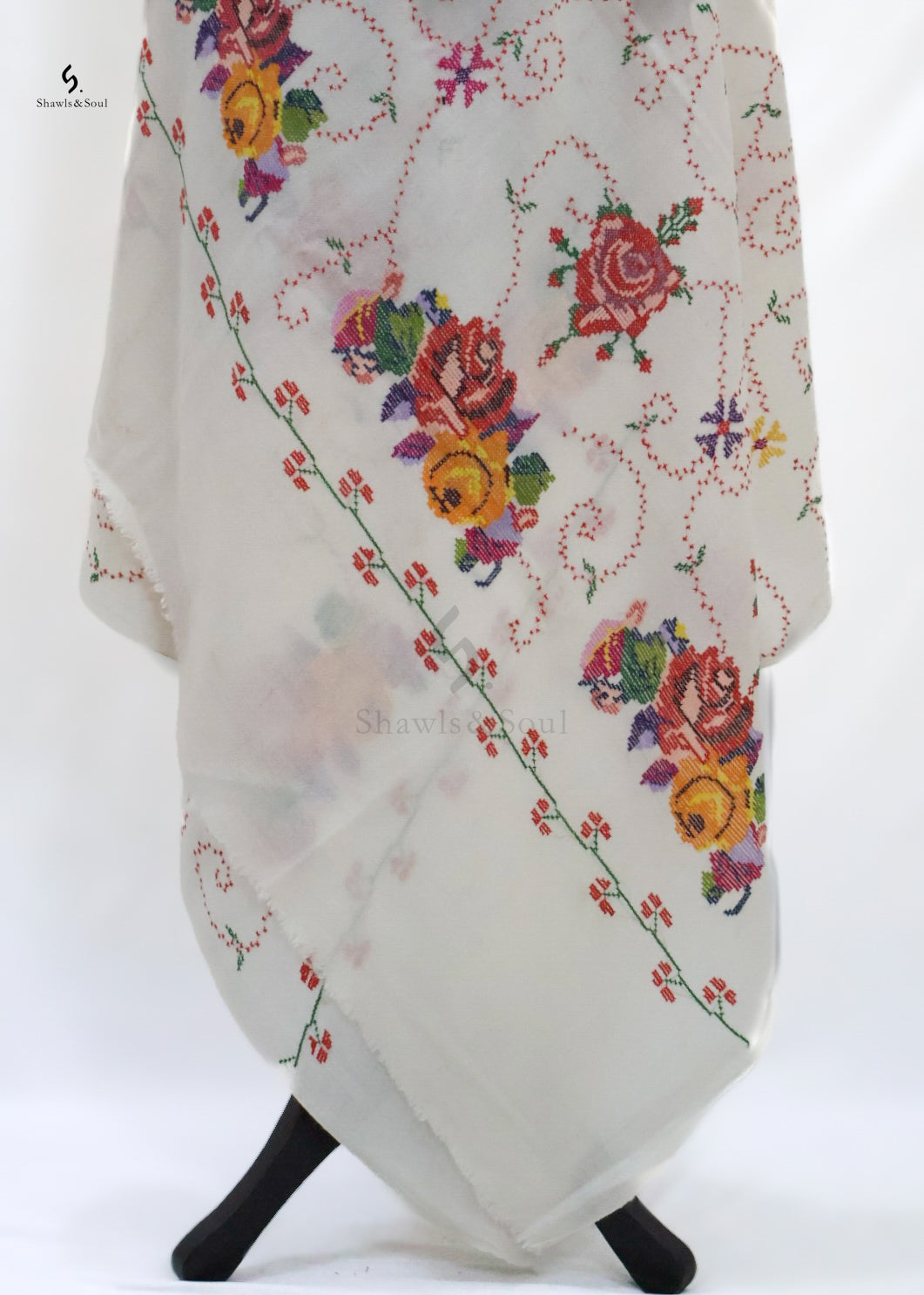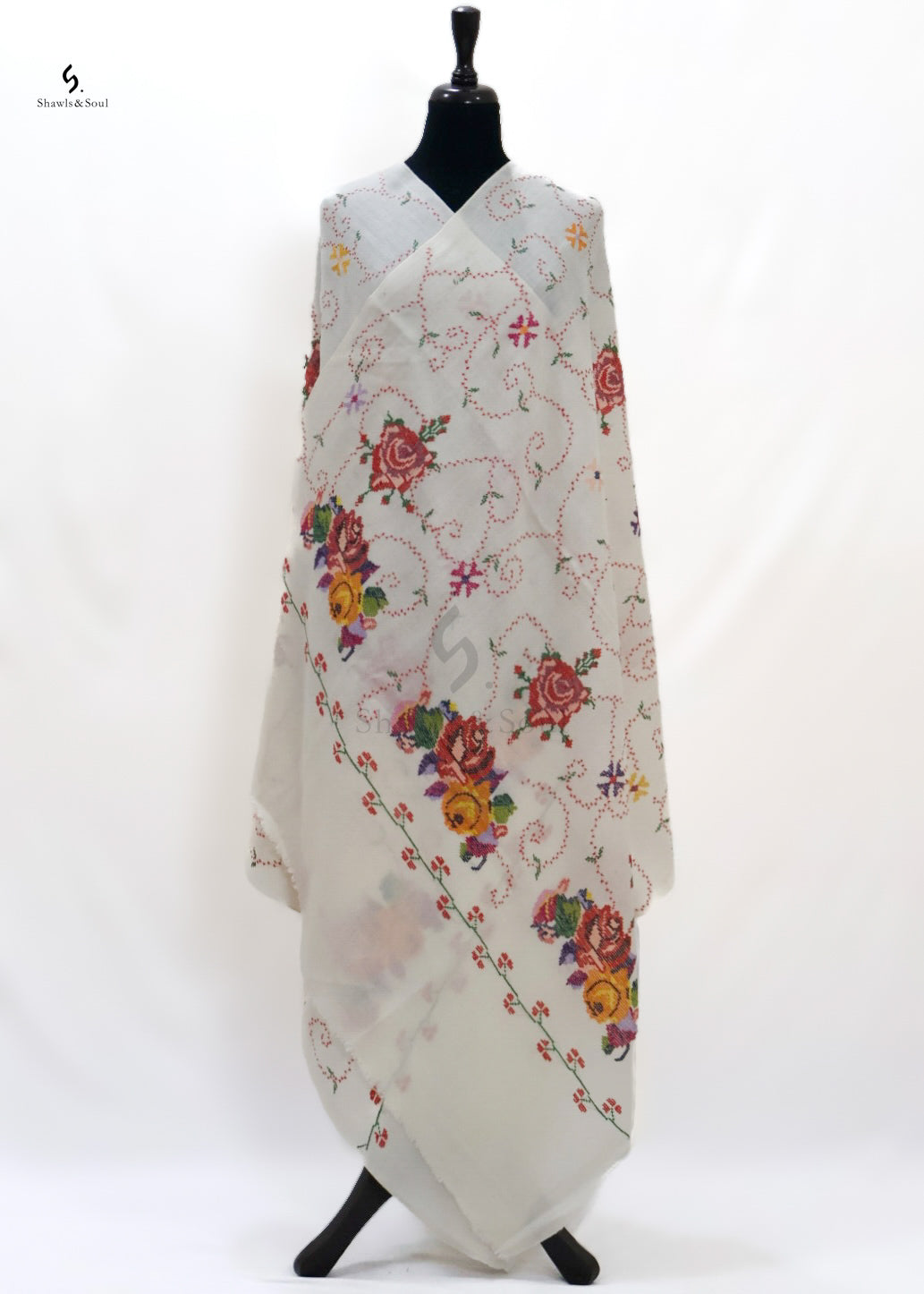 The Rangrez winter shawl is a masterpiece of craftsmanship, featuring full hand-embroidered crossstitch patterns that bring delicate beauty and texture to every inch. This luxurious shawl blends traditional artistry with functional warmth, making it an elegant choice to elevate your winter ensemble.