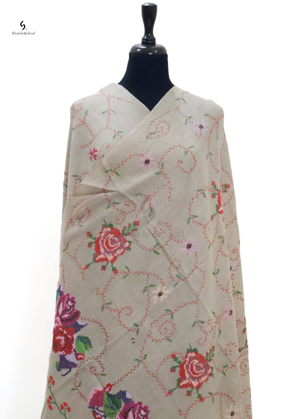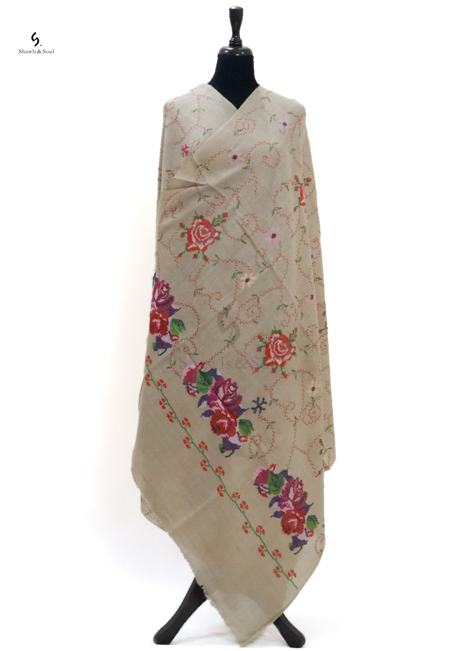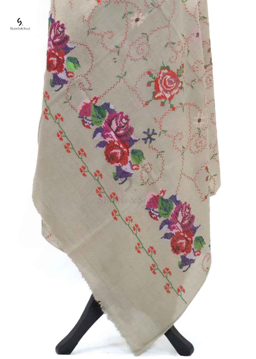 The Rangrez winter shawl is a masterpiece of craftsmanship, featuring full hand-embroidered crossstitch patterns that bring delicate beauty and texture to every inch. This luxurious shawl blends traditional artistry with functional warmth, making it an elegant choice to elevate your winter ensemble.