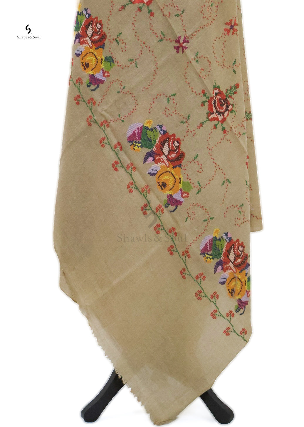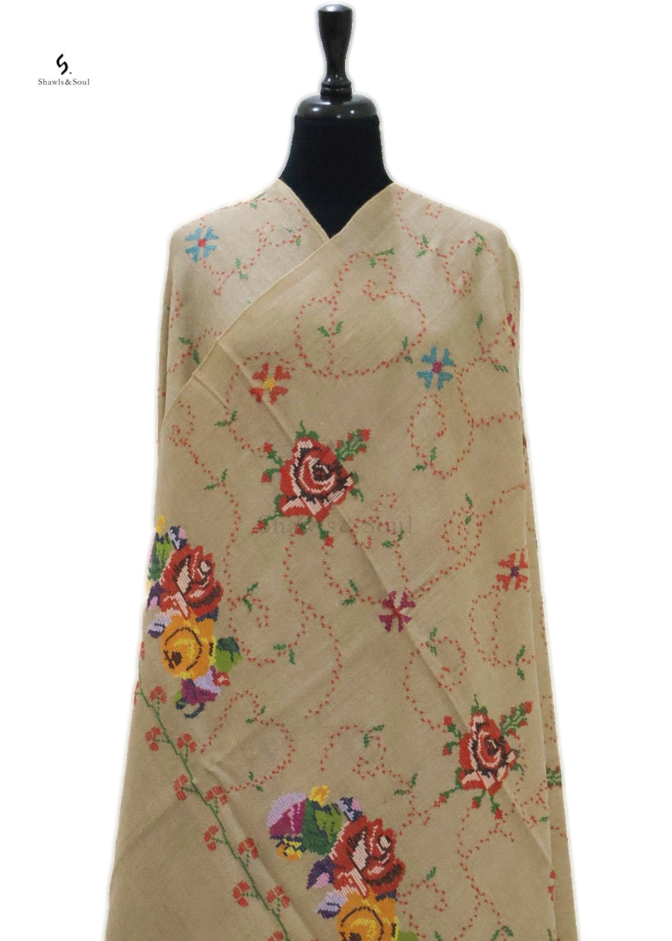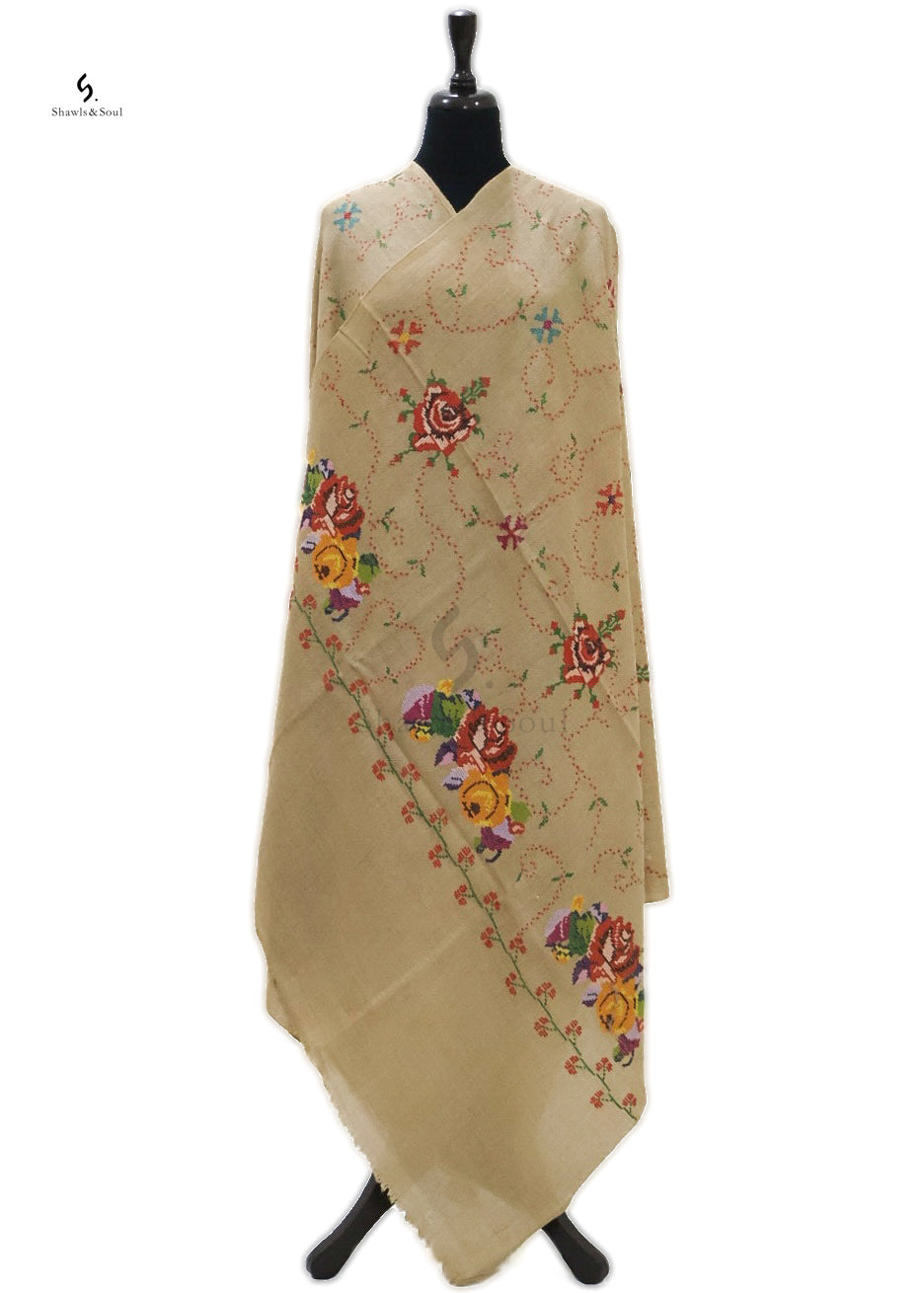 The Rangrez winter shawl is a masterpiece of craftsmanship, featuring full hand-embroidered crossstitch patterns that bring delicate beauty and texture to every inch. This luxurious shawl blends traditional artistry with functional warmth, making it an elegant choice to elevate your winter ensemble.