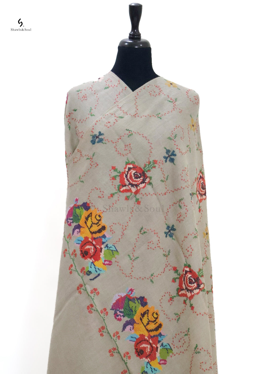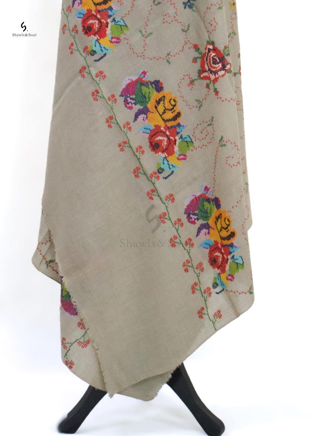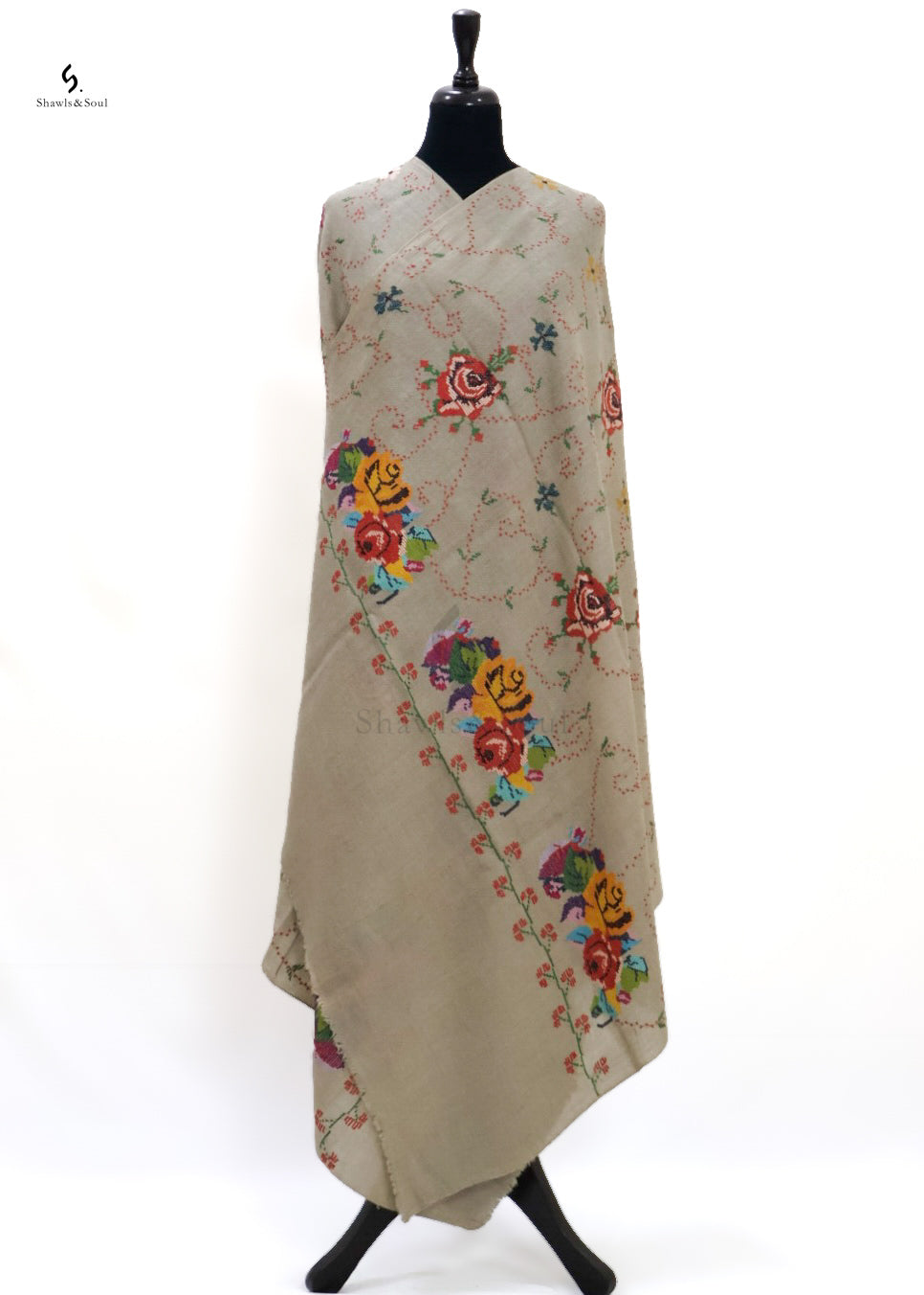 The Rangrez winter shawl is a masterpiece of craftsmanship, featuring full hand-embroidered crossstitch patterns that bring delicate beauty and texture to every inch. This luxurious shawl blends traditional artistry with functional warmth, making it an elegant choice to elevate your winter ensemble.
