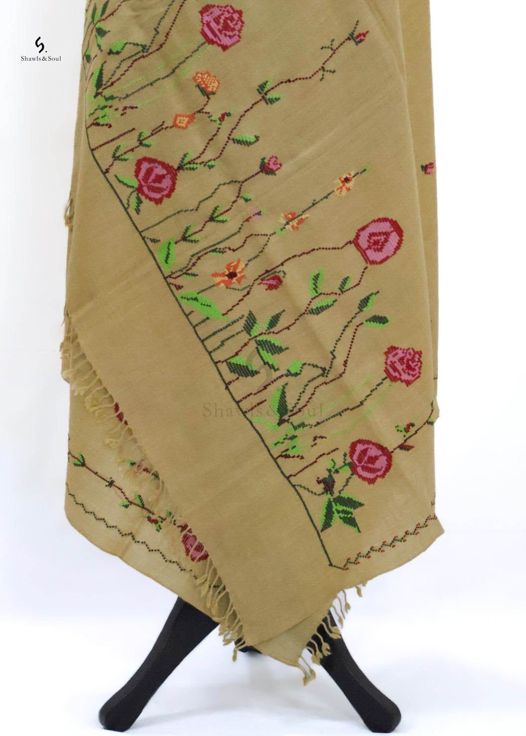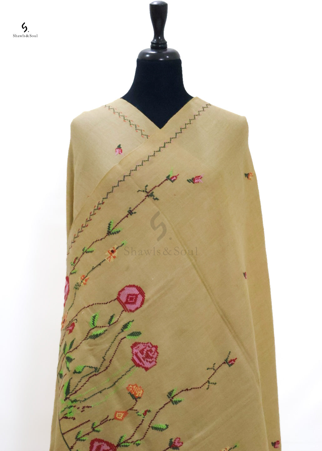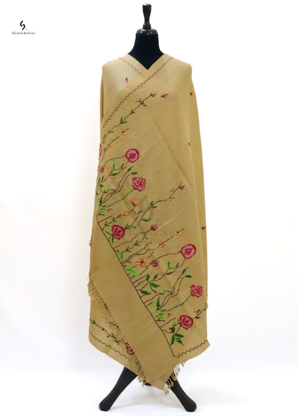 The Sunehri Bel woolen shawl blends warmth with artistry through its refined cross stitch embroidery. Crafted for the discerning wearer, it offers both comfort and a distinguished aesthetic, making it an impeccable accessory for sophisticated winter ensembles.