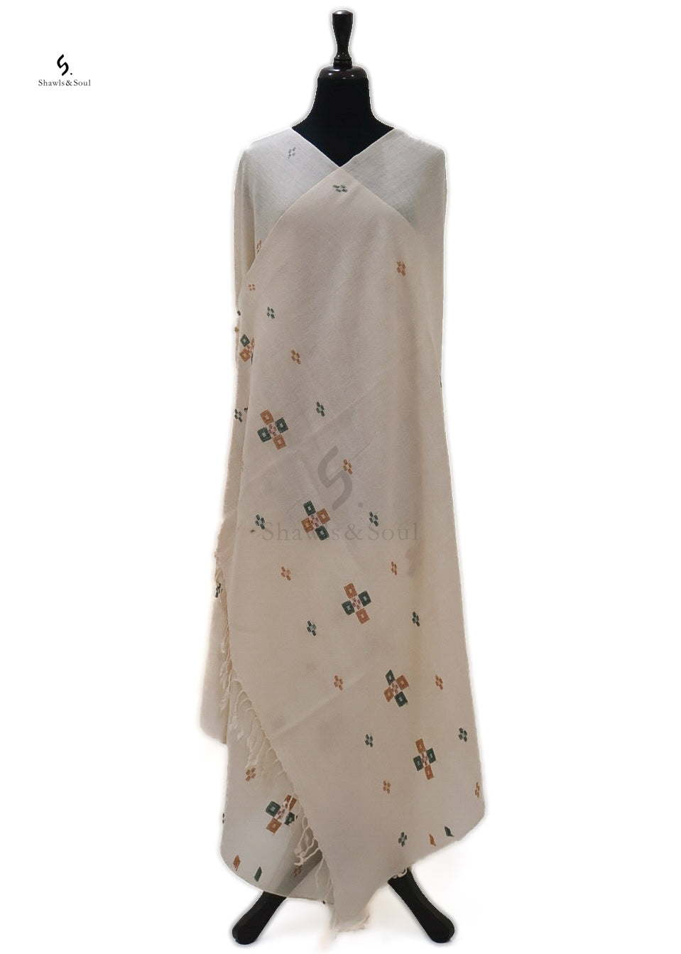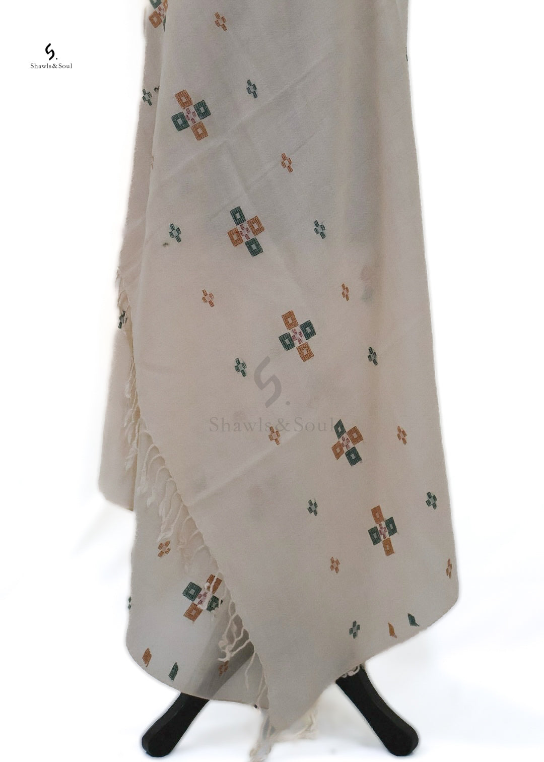 Swati Sundus is a woolen winter shawl, enhanced with delicate Kaddi Embroidery for a graceful and warm accessory.