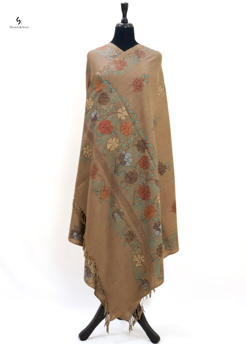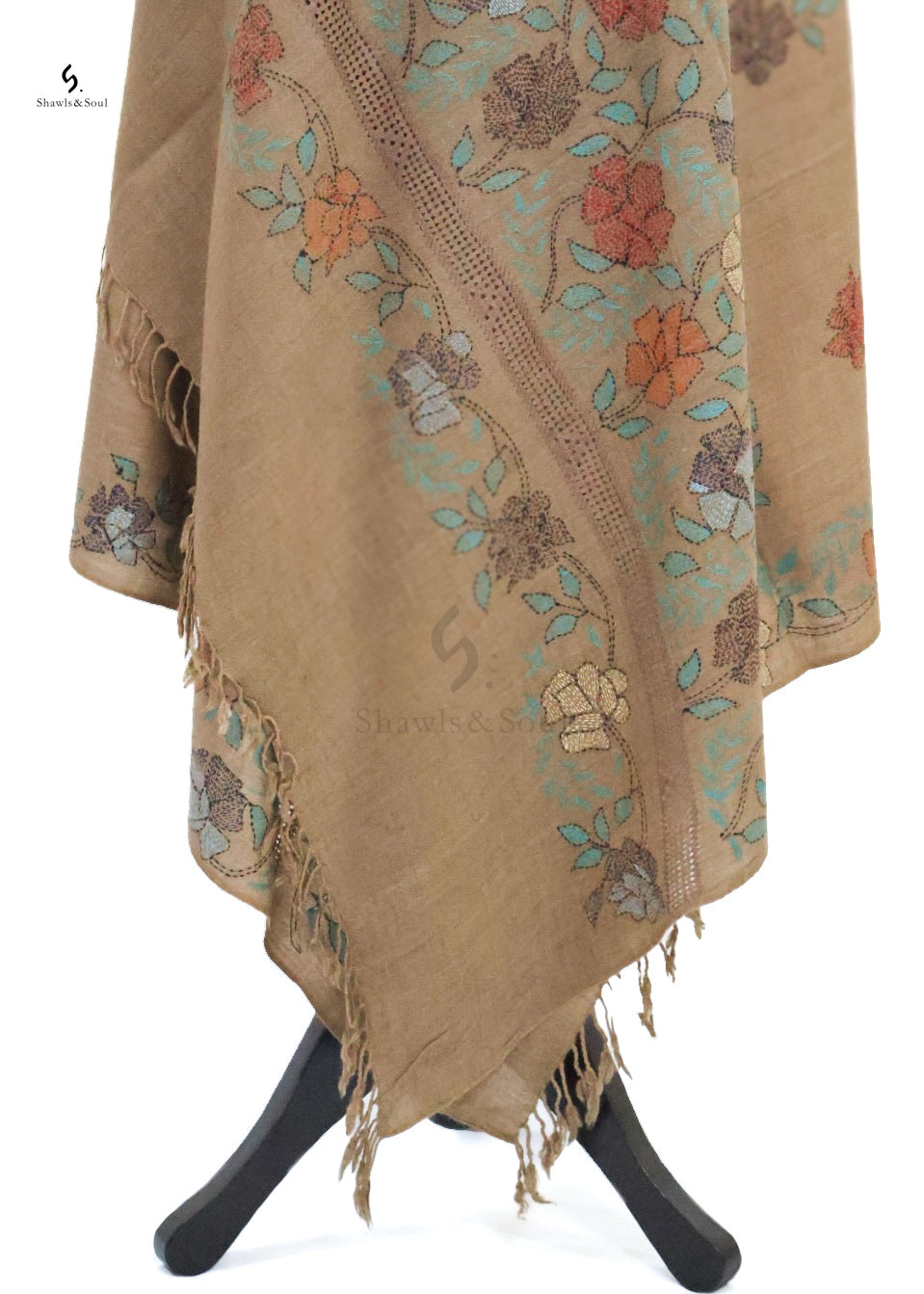 Elevate your elegance with the Threaded Grace woolen shawl, meticulously hand-embroidered with intricate kacha work and delicate taarkashi. This refined piece combines warmth and artisanal craftsmanship, making it a timeless accessory that enhances any sophisticated ensemble.