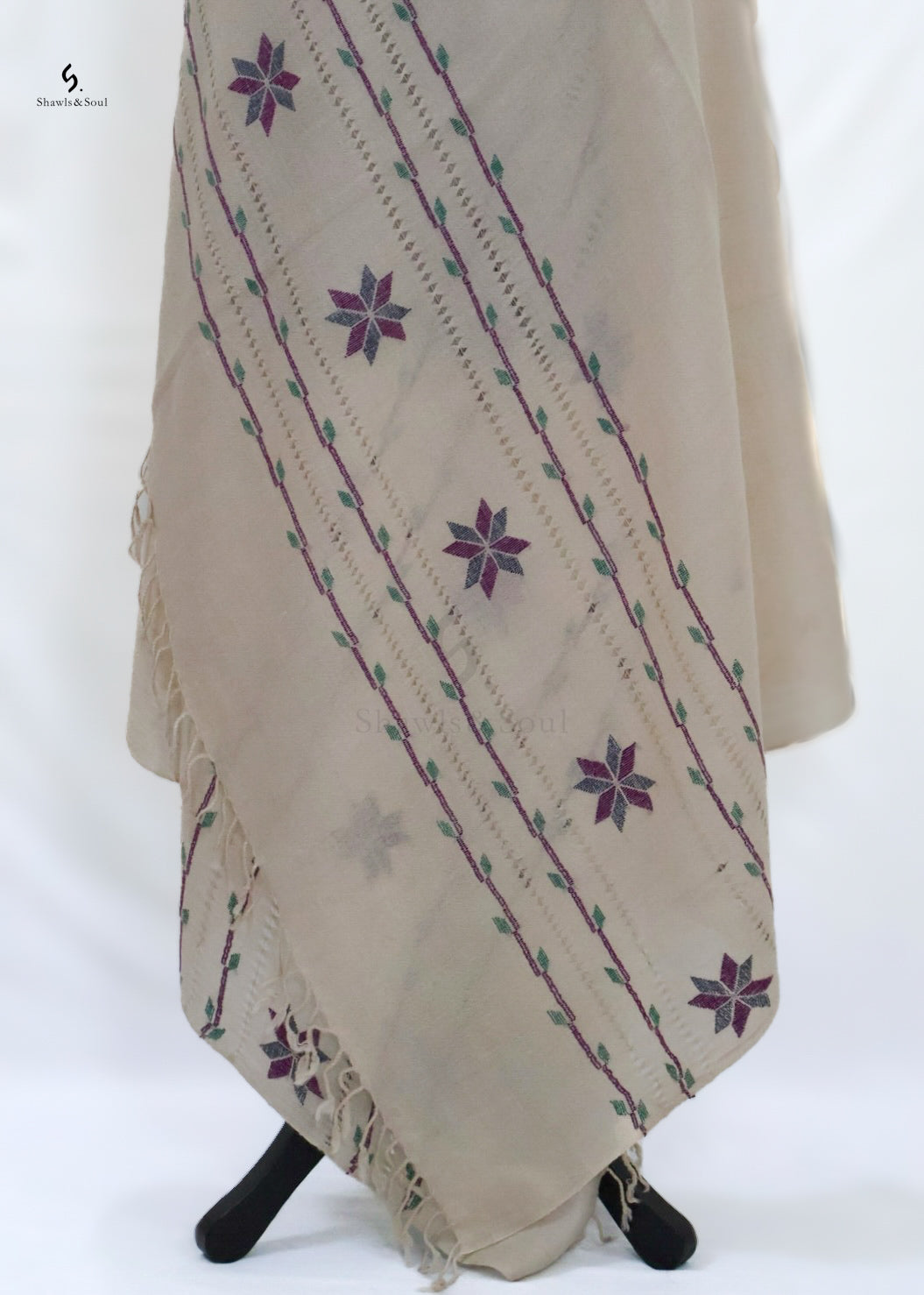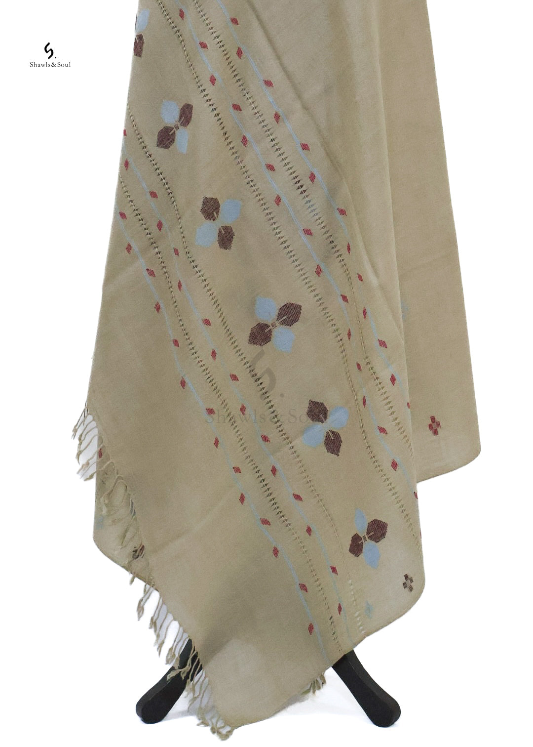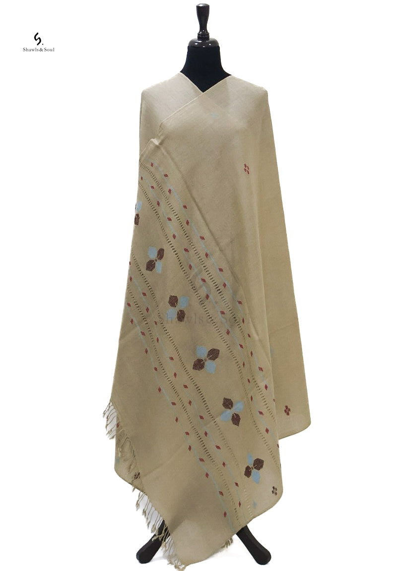 The Woven Gleam A woolen shawl combines durable comfort with traditional Kaddi embroidery. Designed for everyday elegance, it offers gentle warmth and a subtle touch of craftsmanship, making it a versatile addition to any wardrobe.
