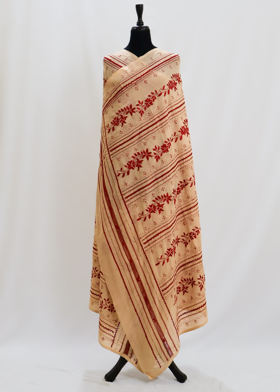 A graceful shawl in Swiss lawn, hand-embroidered with delicate floral patterns in vibrant red color. Lightweight and breathable, perfect for effortless summer elegance with a touch of tradition.
